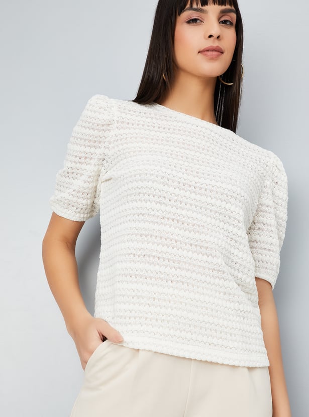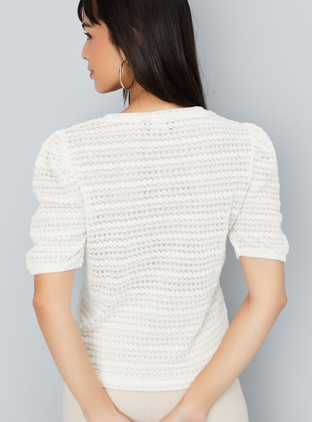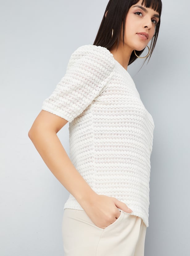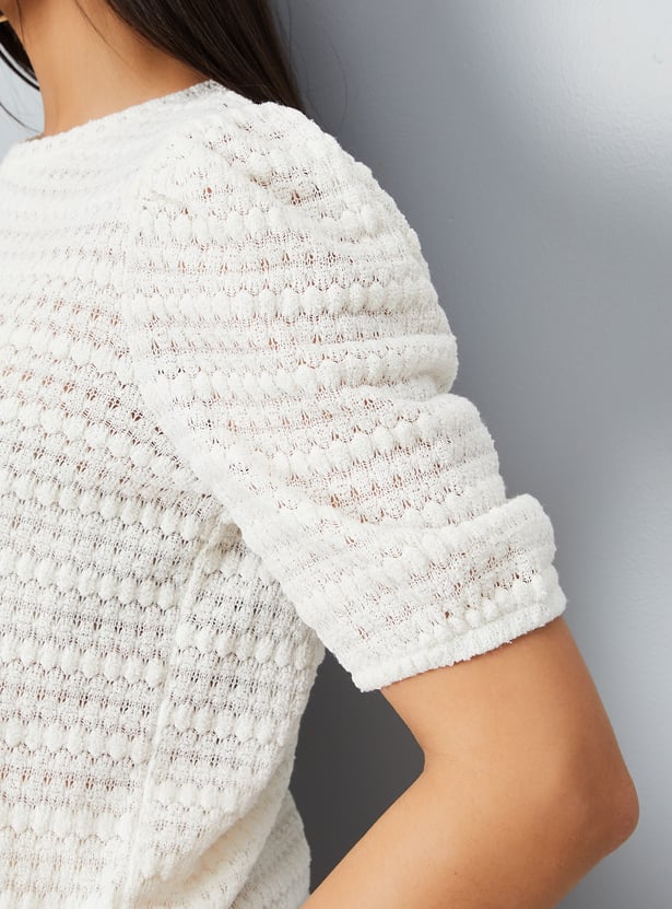 This knit textured top combines cozy comfort with feminine details. Featuring a classic round neck and puff half sleeves, it offers a flattering silhouette perfect for layering or wearing on its own.
