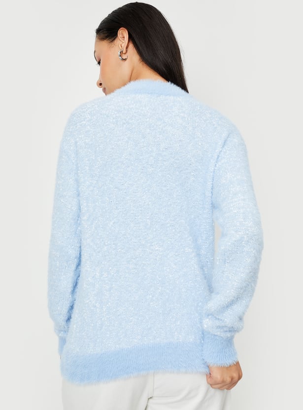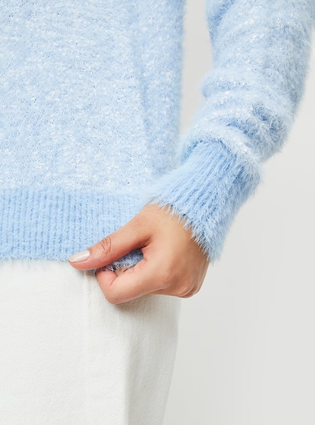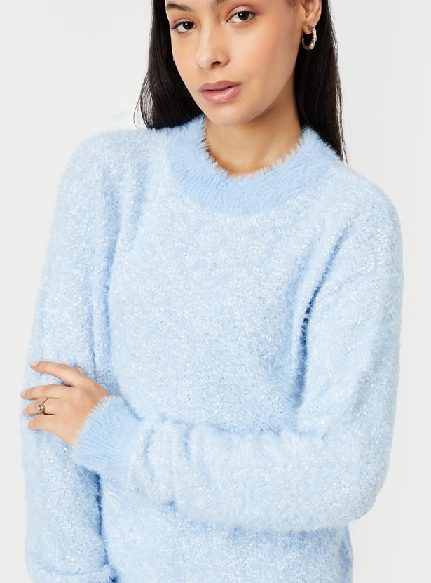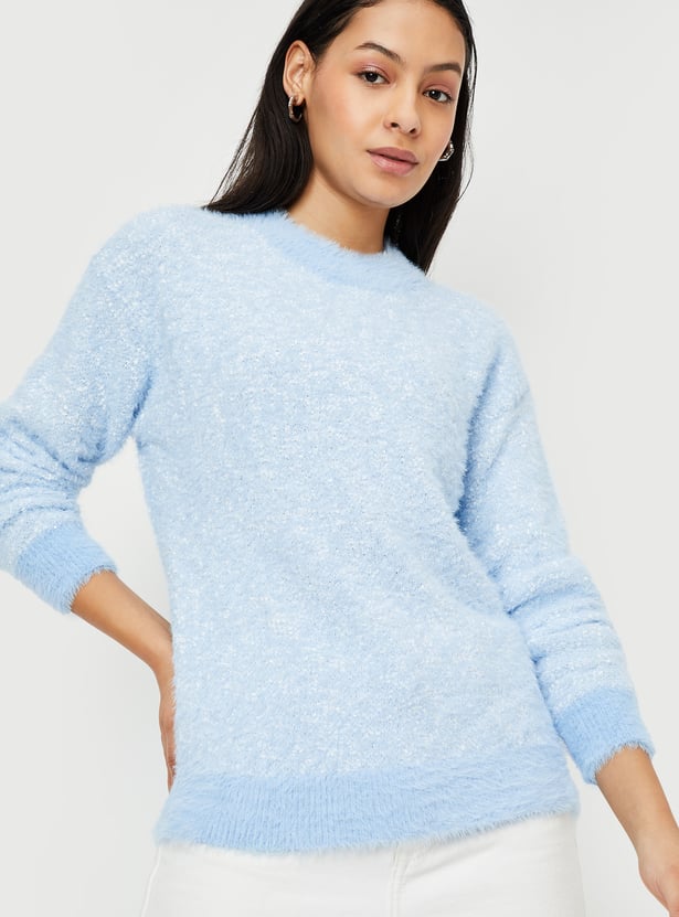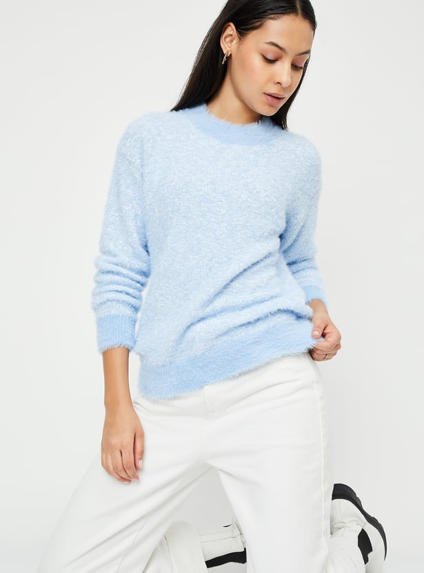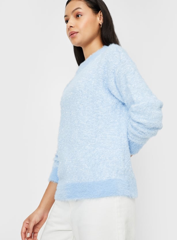 Stay cozy and stylish with this knitted plush textured sweater. Featuring long sleeves, a ribbed hem, and a round neck, it offers both warmth and a flattering fit. Perfect for layering or wearing on its own, this sweater adds a touch of elegance to any casual outfit.