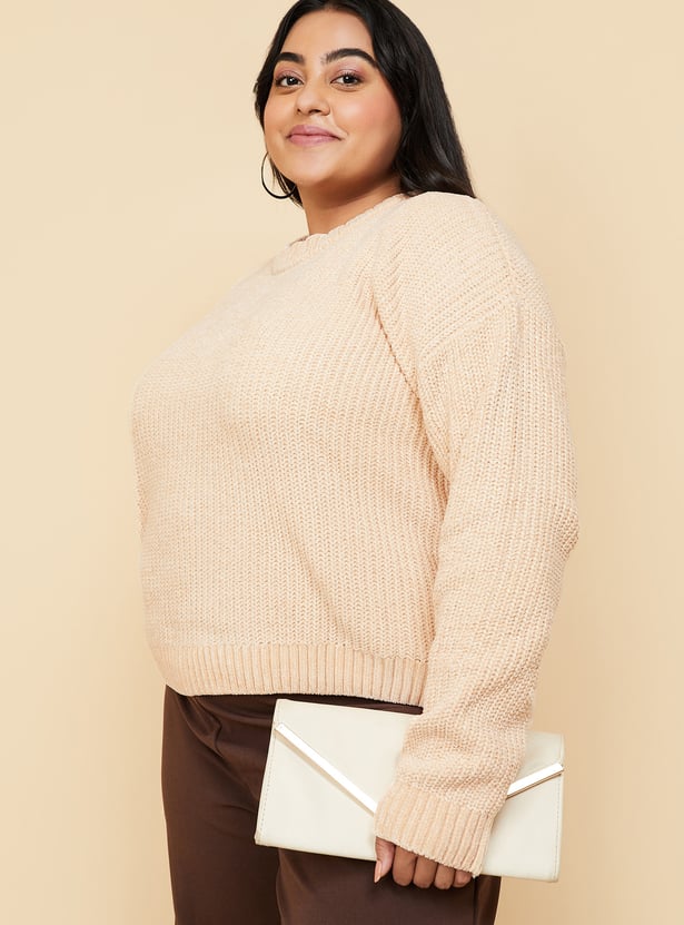 This cosy knitted sweater features a classic round neck, full sleeves, and a ribbed hem for added comfort and style. Its timeless design makes it perfect for layering or wearing on its own during cooler days.