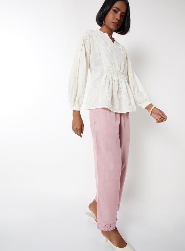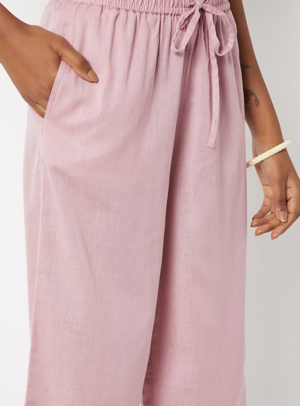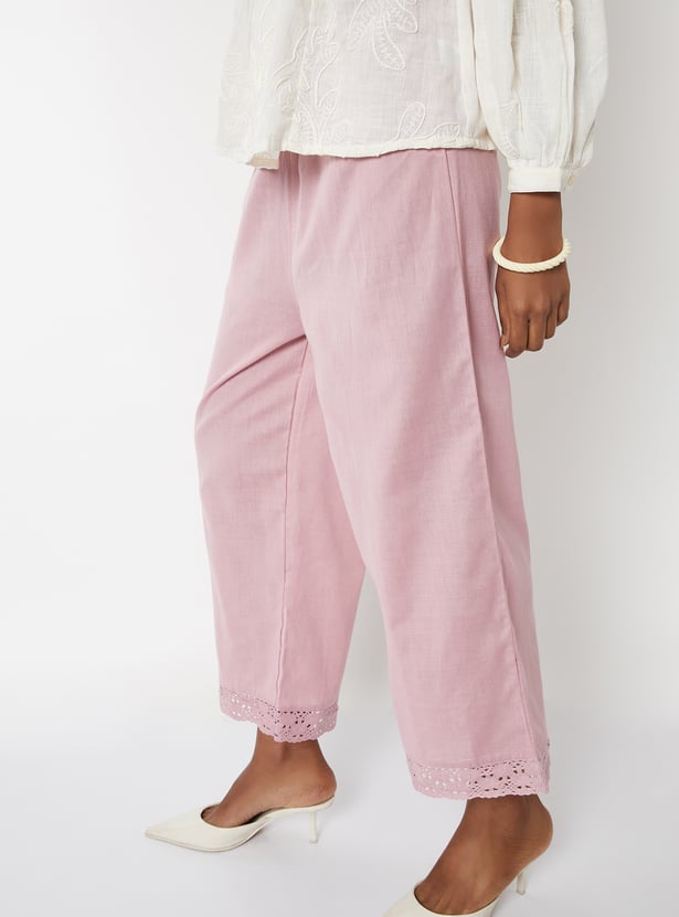 Look effortlessly stylish in this pair of palazzos rendered in a solid tone. It features a drawstring waist, a wide leg profile, and a lace-detailed hem with scalloped trim. Team up this pair with a tunic to nail the fusion look.