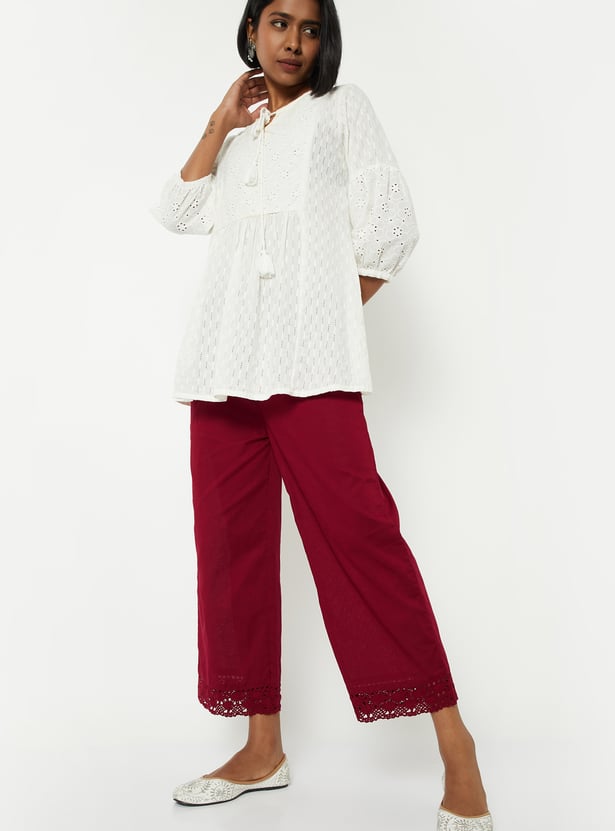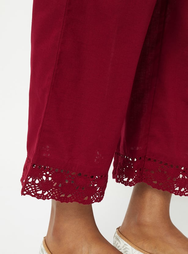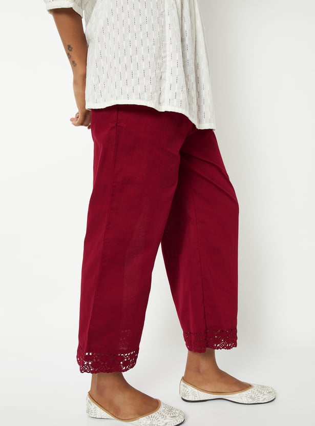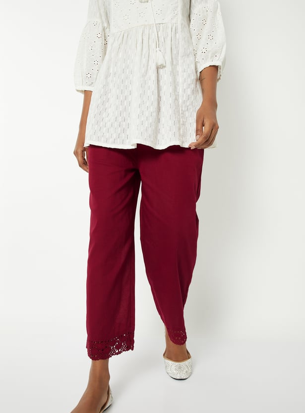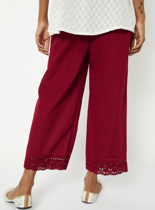 Look effortlessly stylish in this pair of palazzos rendered in a solid tone. It features a drawstring waist, a wide leg profile, and a lace-detailed hem with scalloped trim. Team up this pair with a tunic to nail the fusion look.