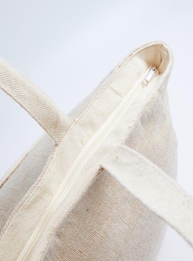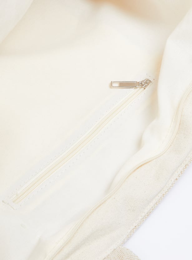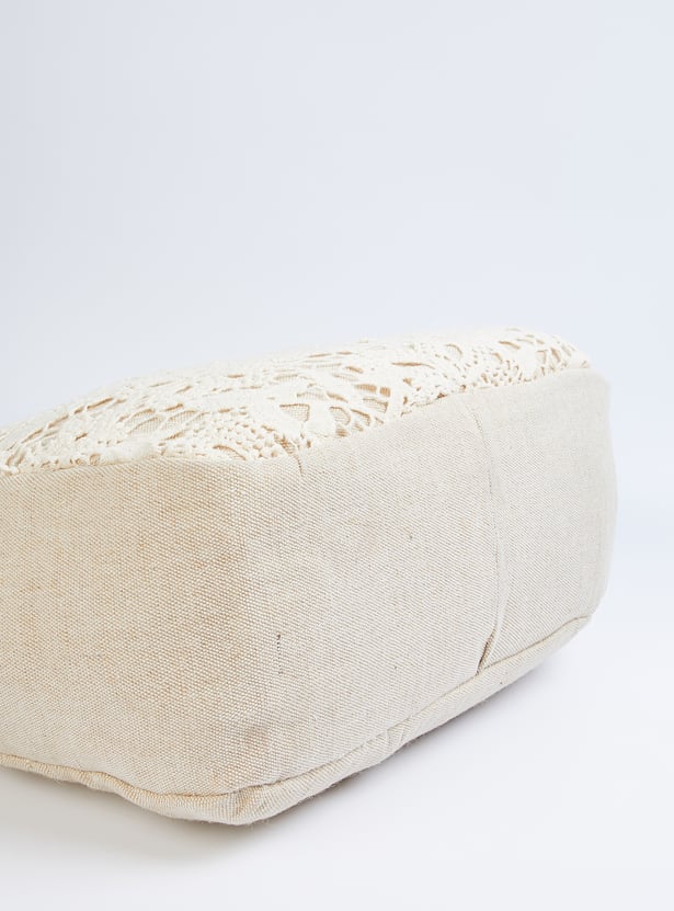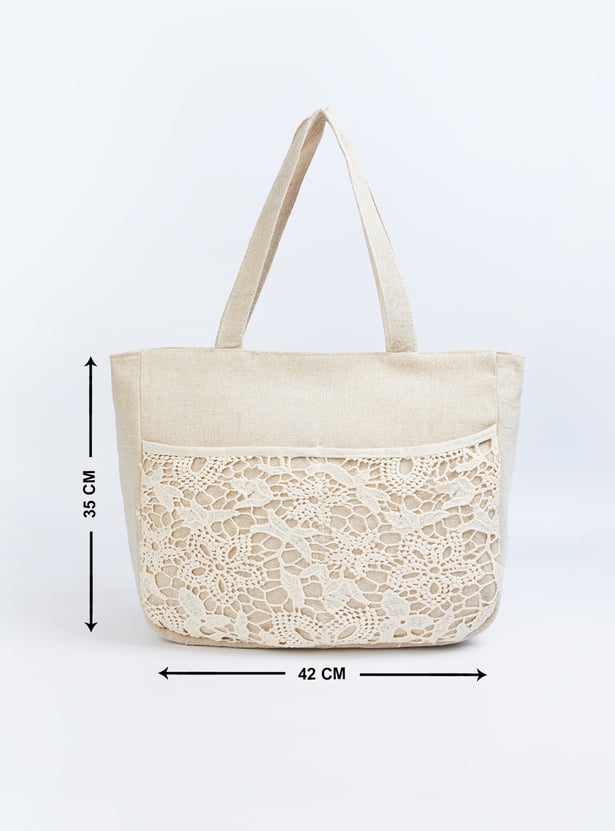 This lace panel tote bag features twin handles and a zip closure, blending elegance with everyday utility. The delicate lace detailing adds a feminine touch.