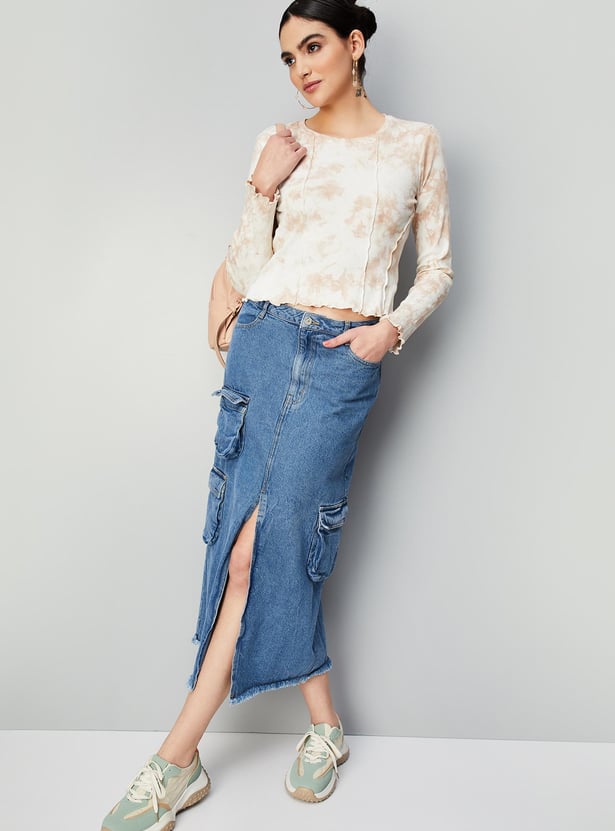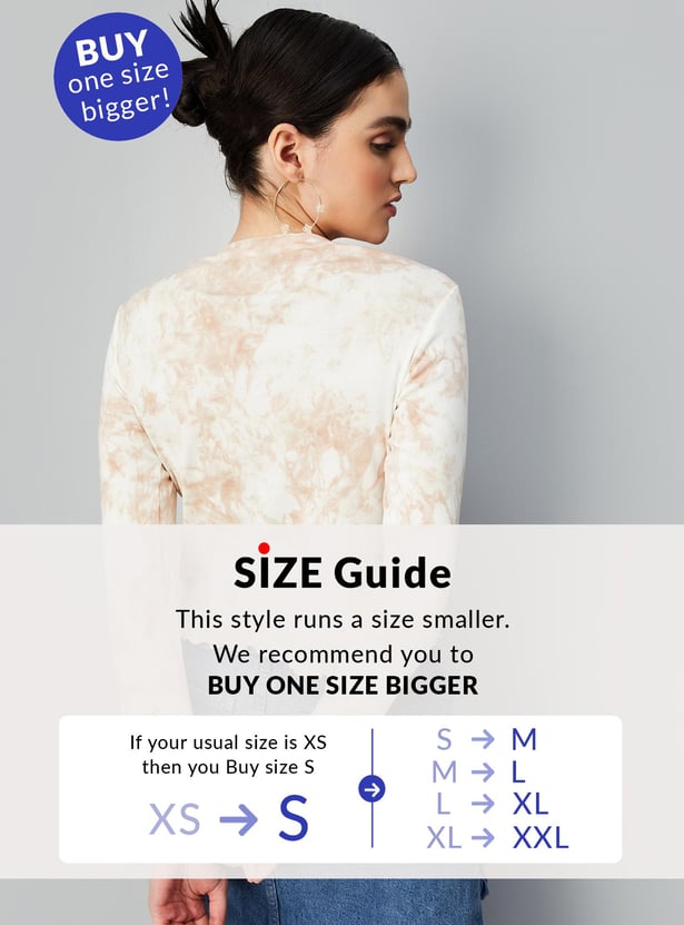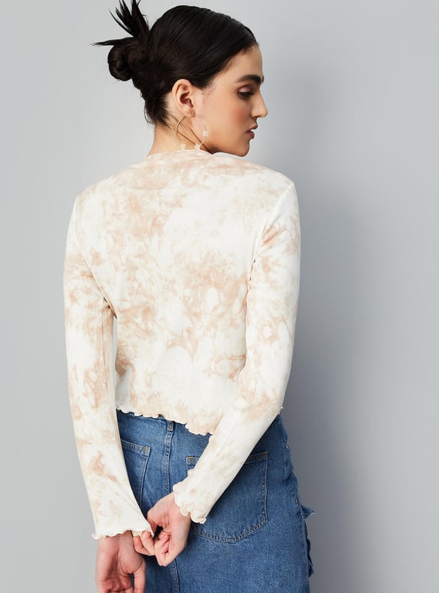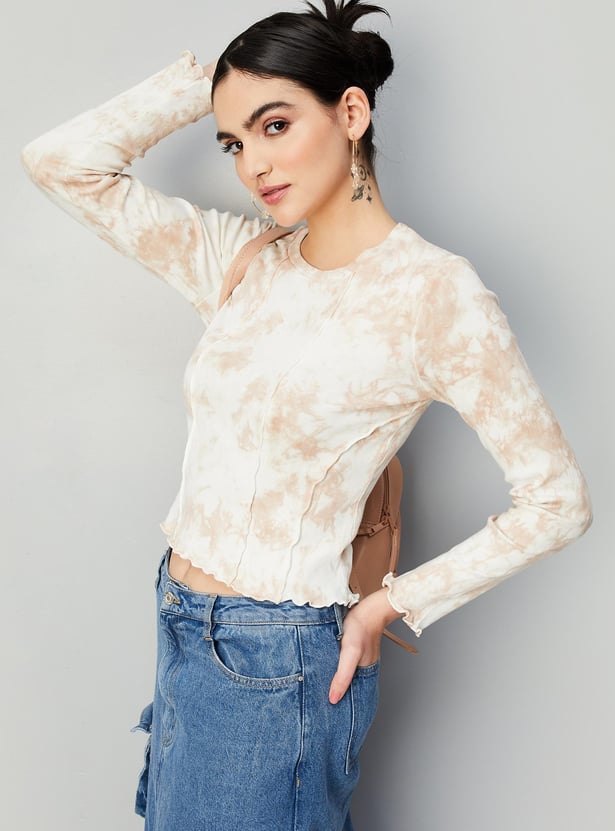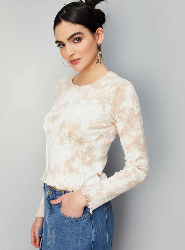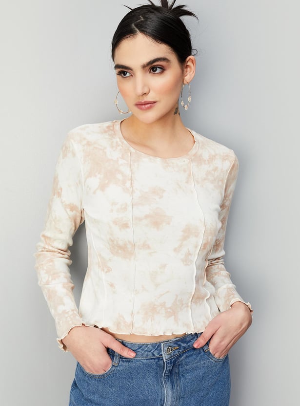 Elevate your casual look with this stylish ribbed top featuring a trendy tie-dye print, round neck, and full sleeves. Pair it with trousers and heels to create a chic outfit that will turn heads.