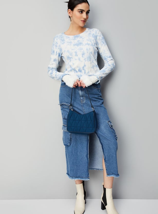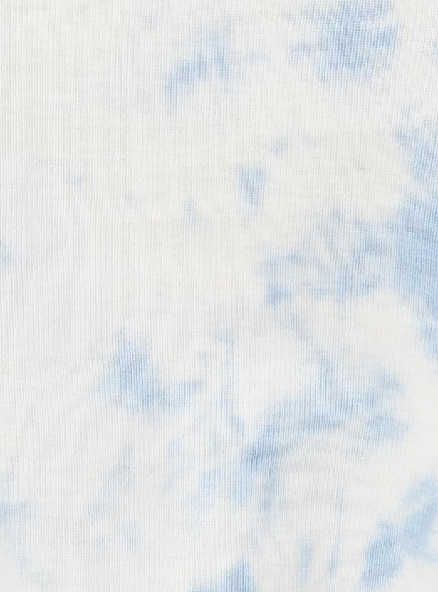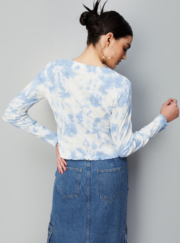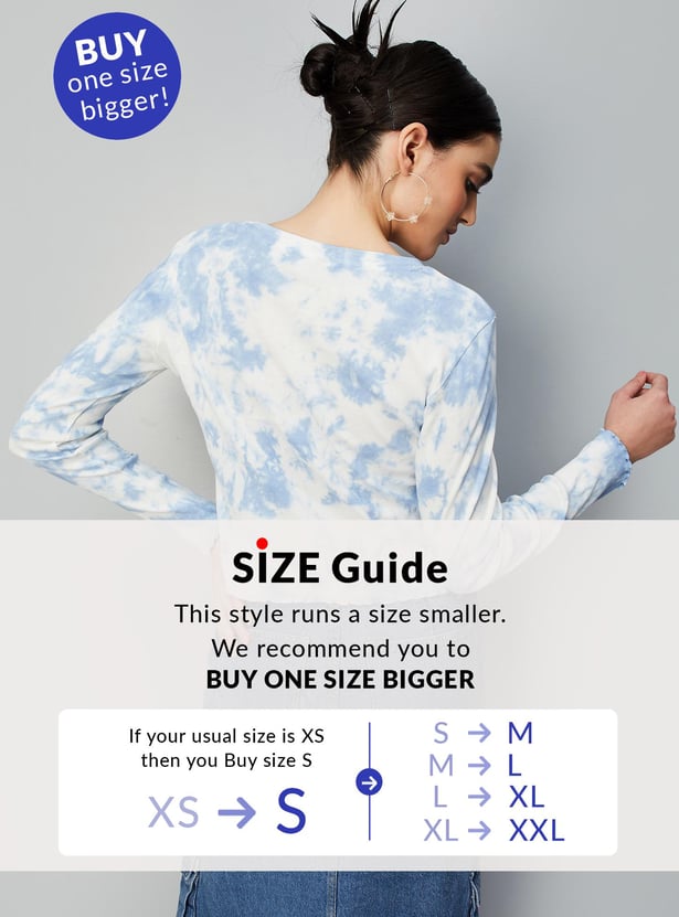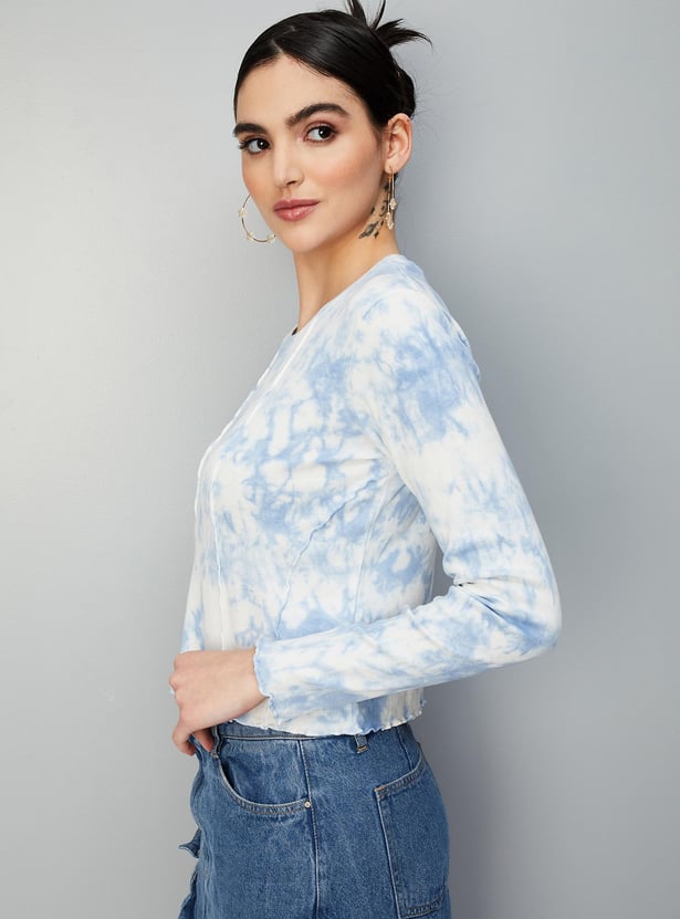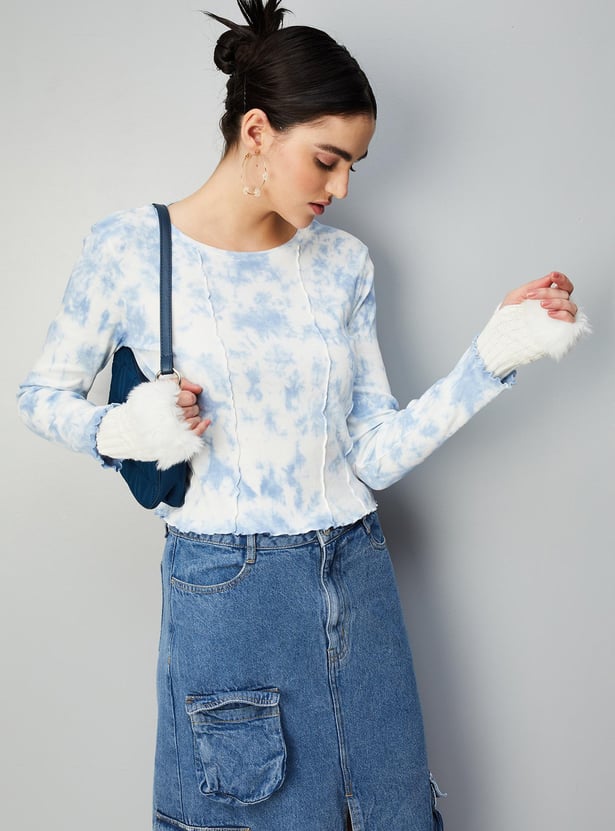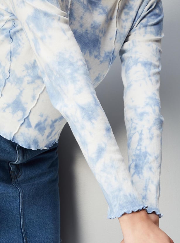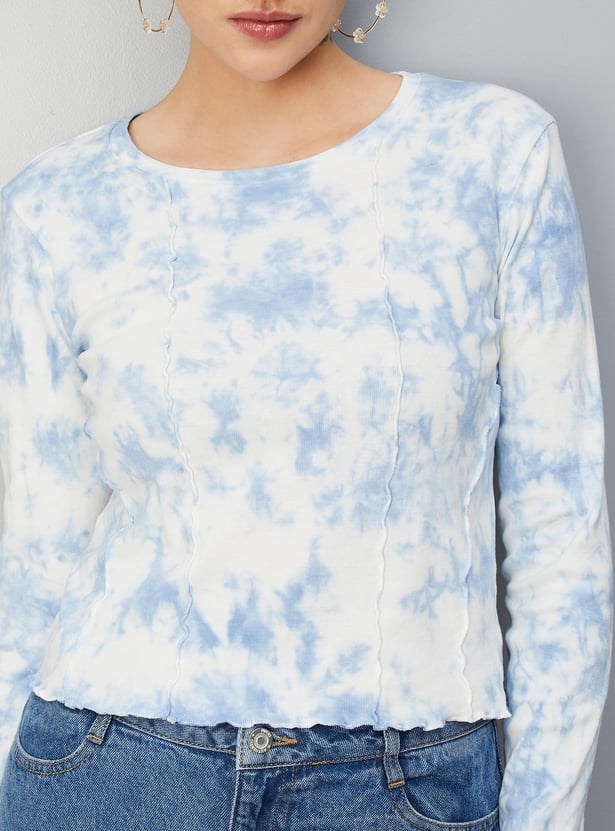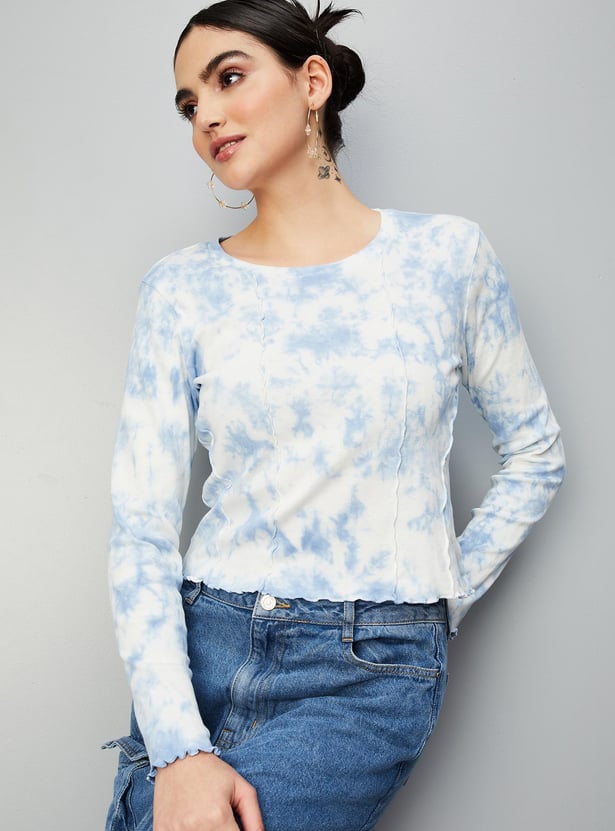 Elevate your casual look with this stylish ribbed top featuring a trendy tie-dye print, round neck, and full sleeves. Pair it with trousers and heels to create a chic outfit that will turn heads.