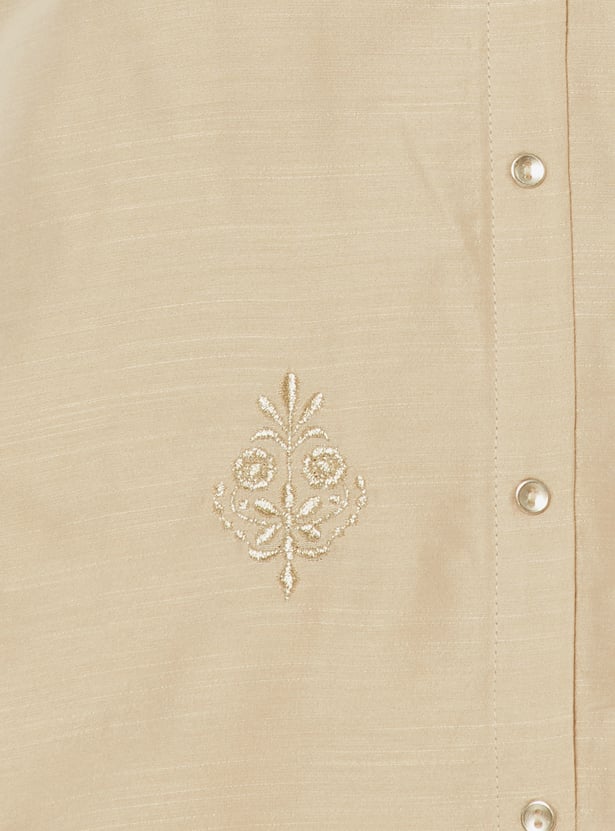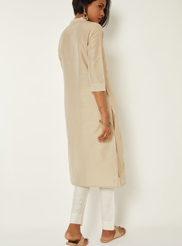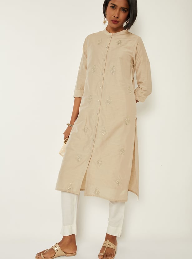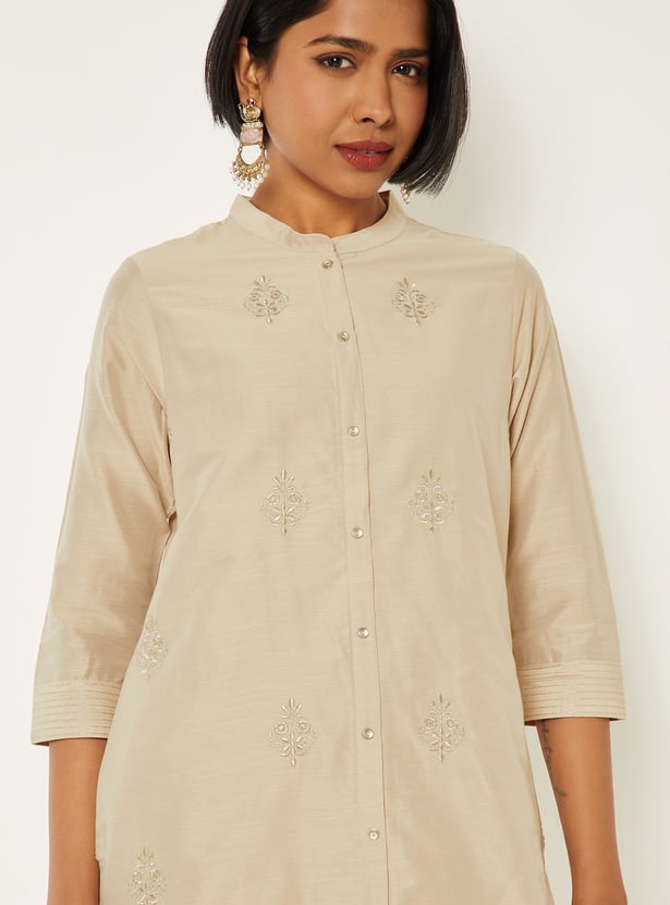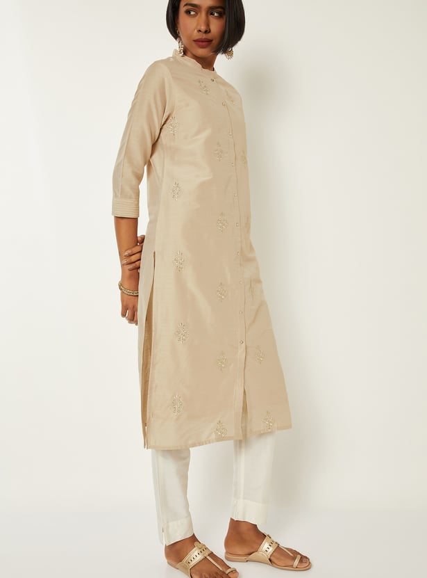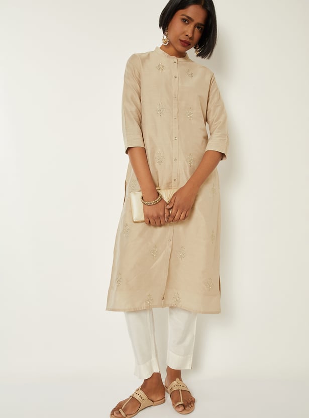Flaunt your elegance in this straight kurta. It features a band collar, 3/4th sleeves, and a full button placket. The metallic embroidered motifs add shine and style.