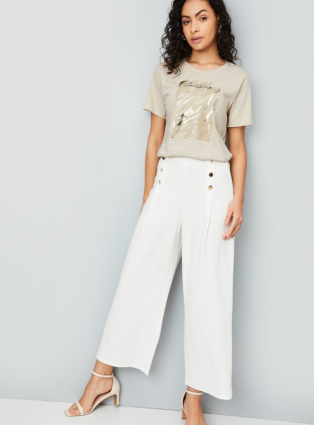 Step into the spotlight with this T-shirt – a must-have addition to your wardrobe. It boasts an eye-catching metallic print, round neck and half sleeves to add some sparkle to your style and make a statement wherever you go.