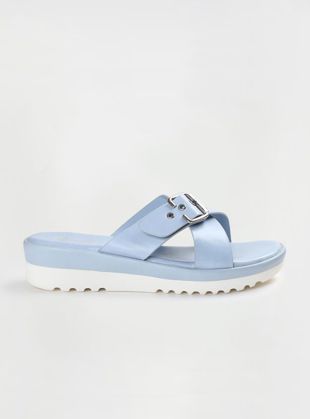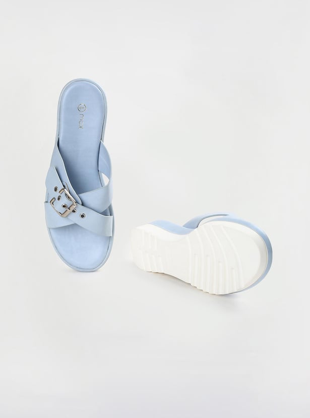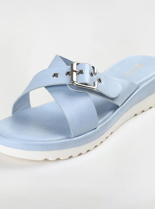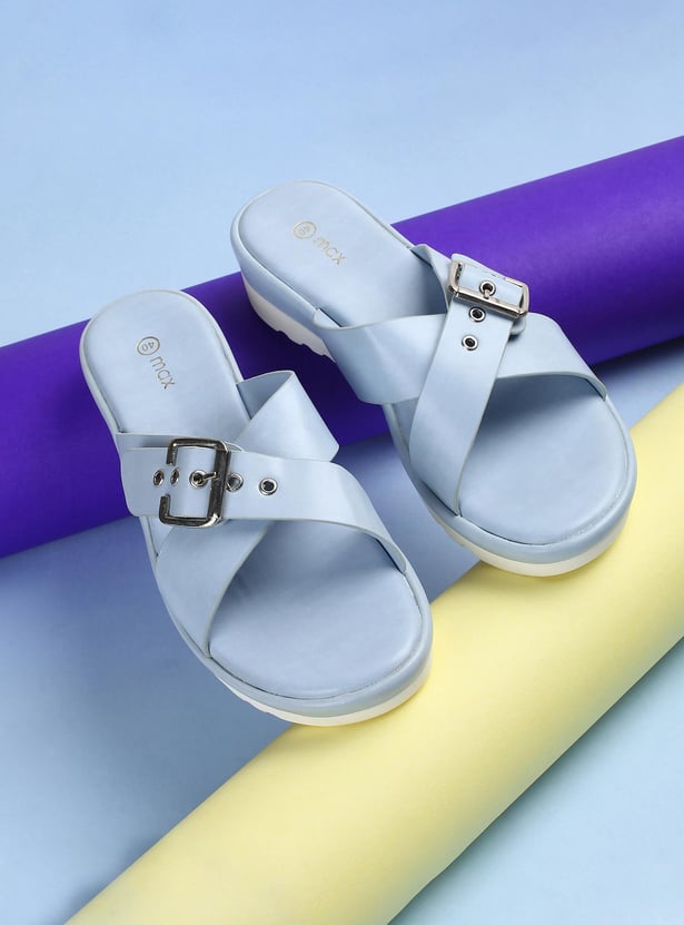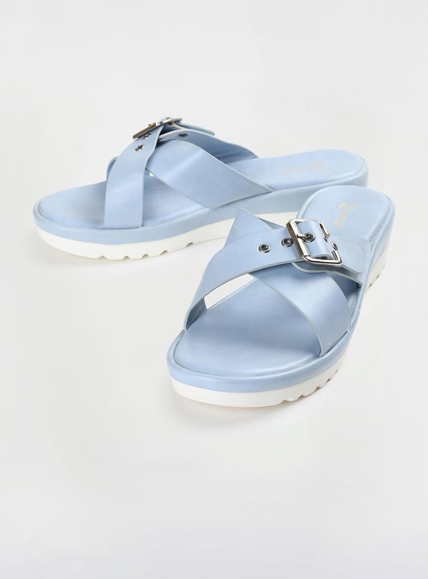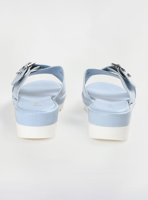 This pair of flatforms has a solid surface, a buckle design, and a cushioned bed. The addition of the grooved soles increases comfort and grip.