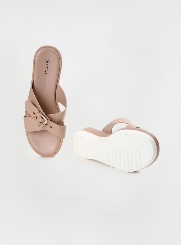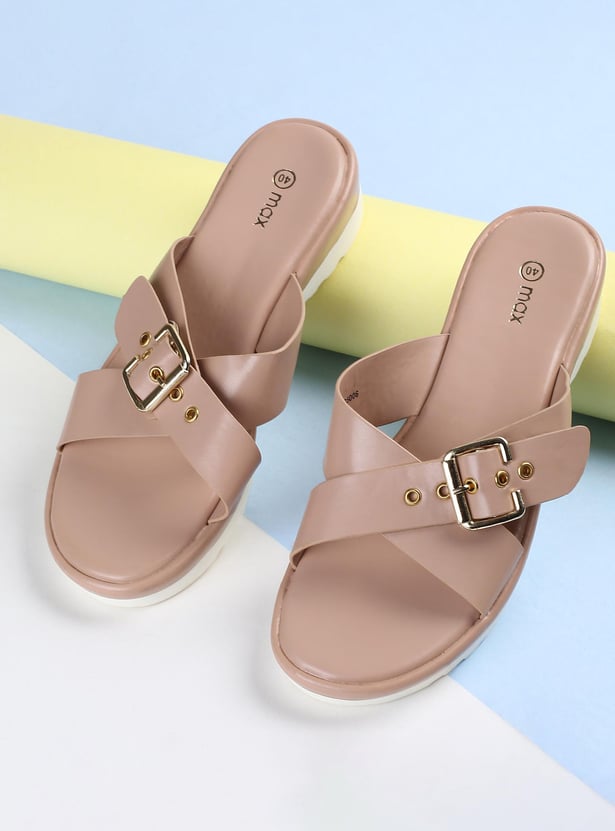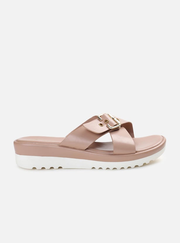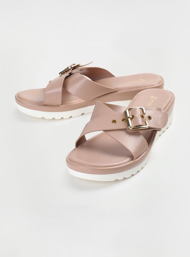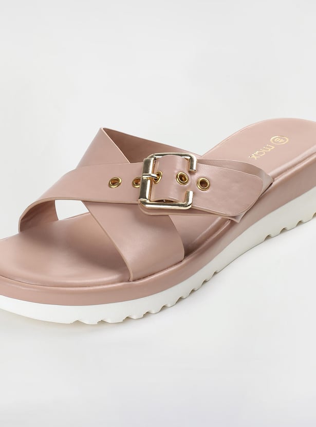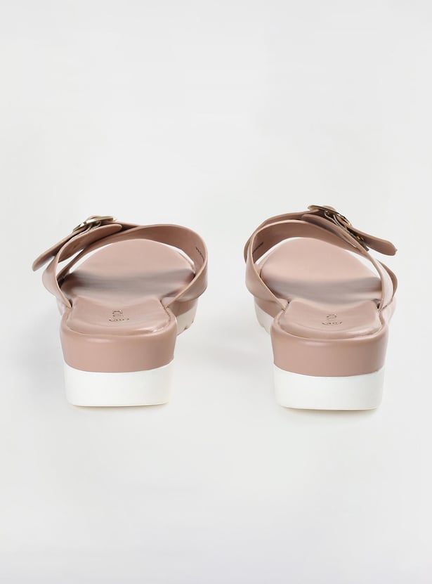 This pair of flatforms has a solid surface, a buckle design, and a cushioned bed. The addition of the grooved soles increases comfort and grip.