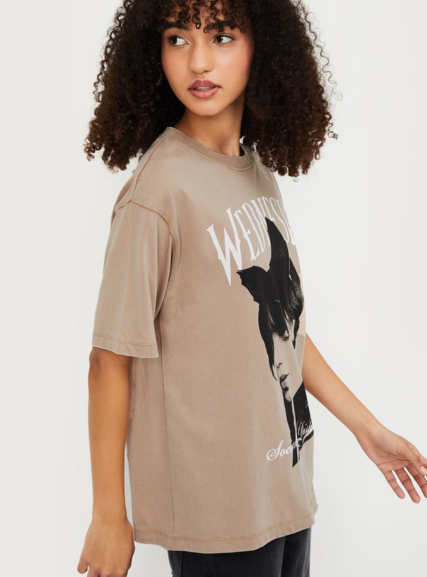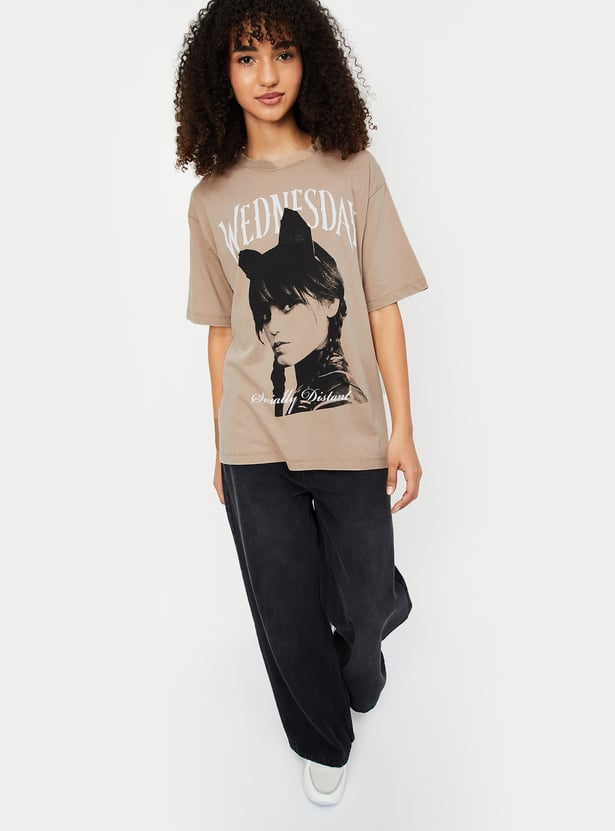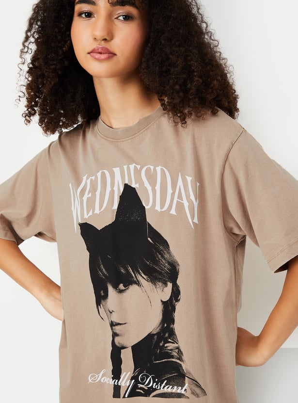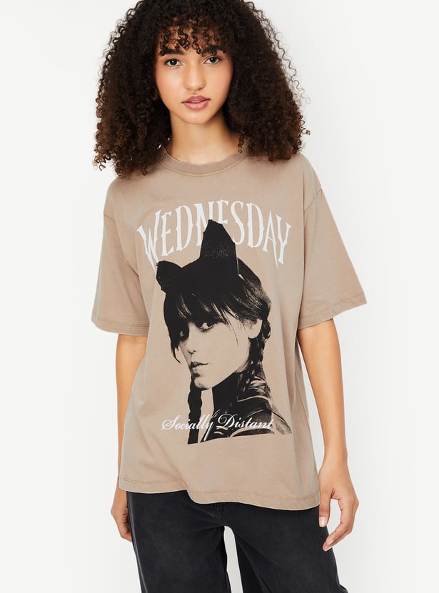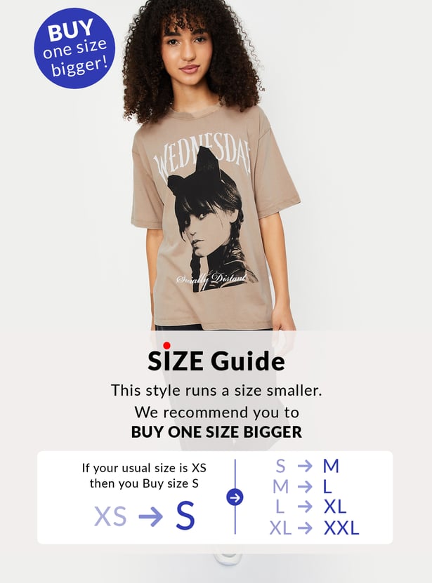 Add a magical touch to your day with this enchanting T-shirt. The Wednesday print adds an alluring flair, while the design features a round neck, drop shoulders, and half sleeves. Make a bold statement with this oversized T-shirt, perfect for a relaxed, casual look. Model Size :