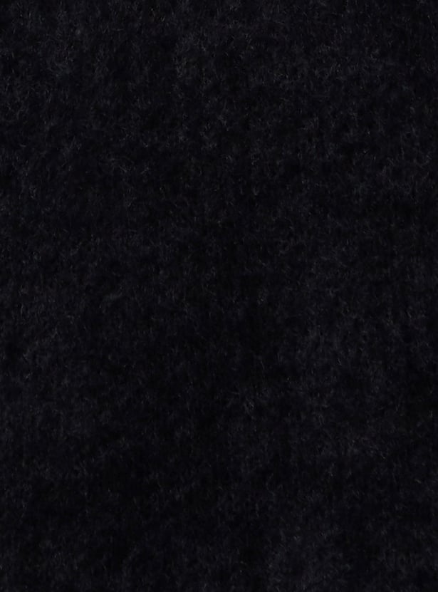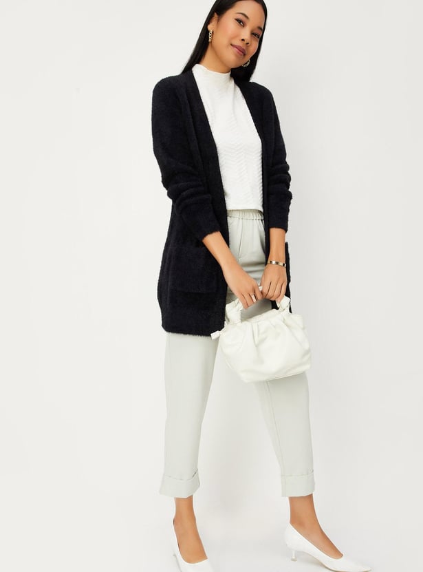 Complete your winter outfit with a solid plush yarn shrug featuring an open front, full sleeves, and waist pockets. Pair it with a tee and trousers to achieve the perfect look.