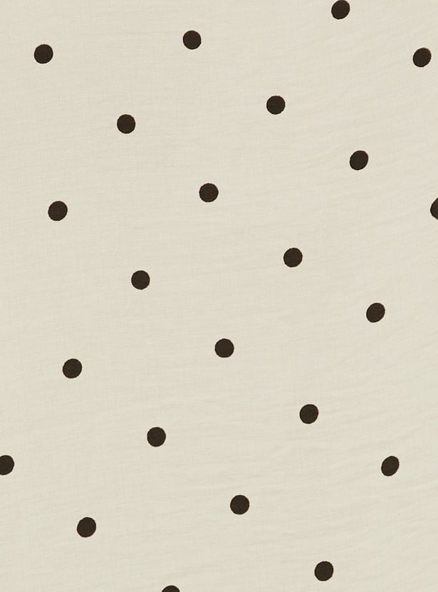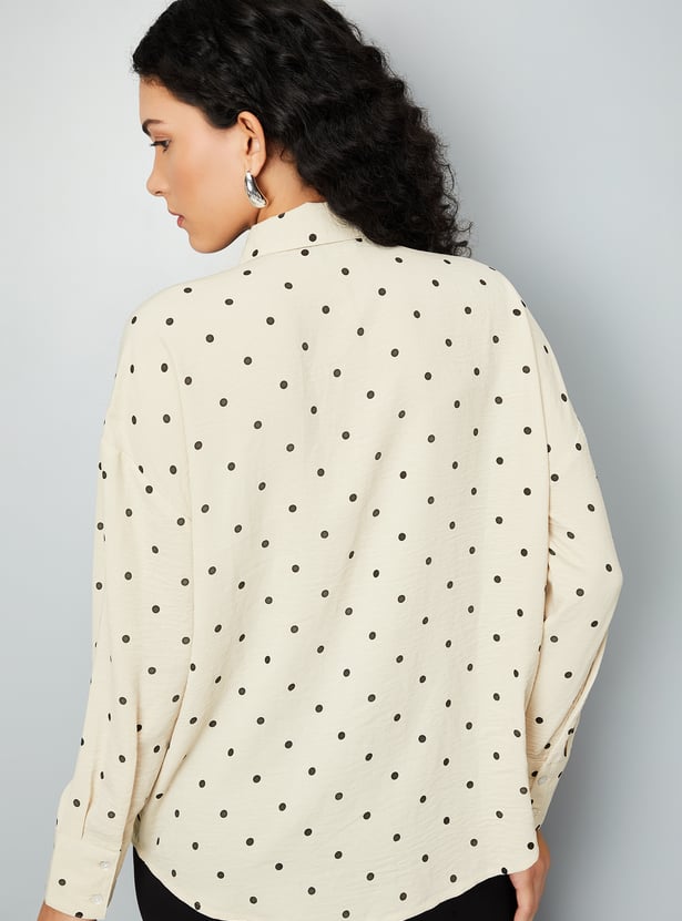This polka dot printed shirt features a spread collar and long sleeves, giving it a timeless and chic appeal. Its curved hem offers a flattering fit, making it a stylish choice for both formal occasions. Ideal for adding a playful yet sophisticated touch to your wardrobe.