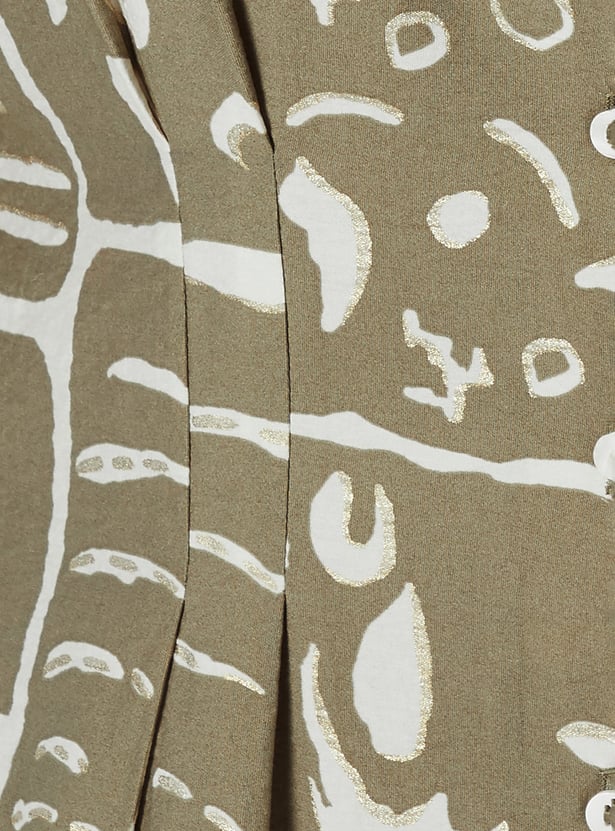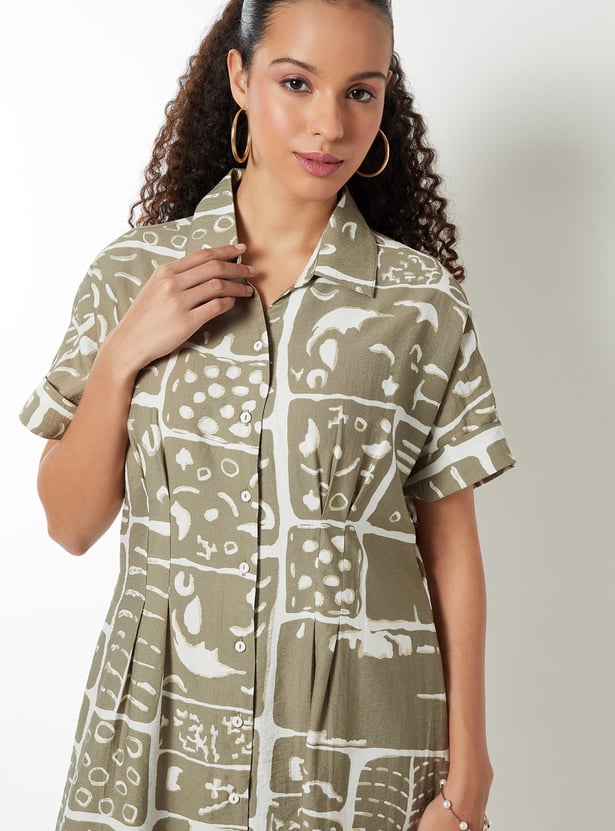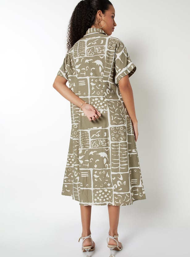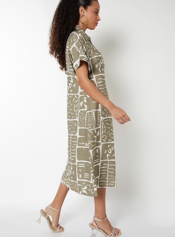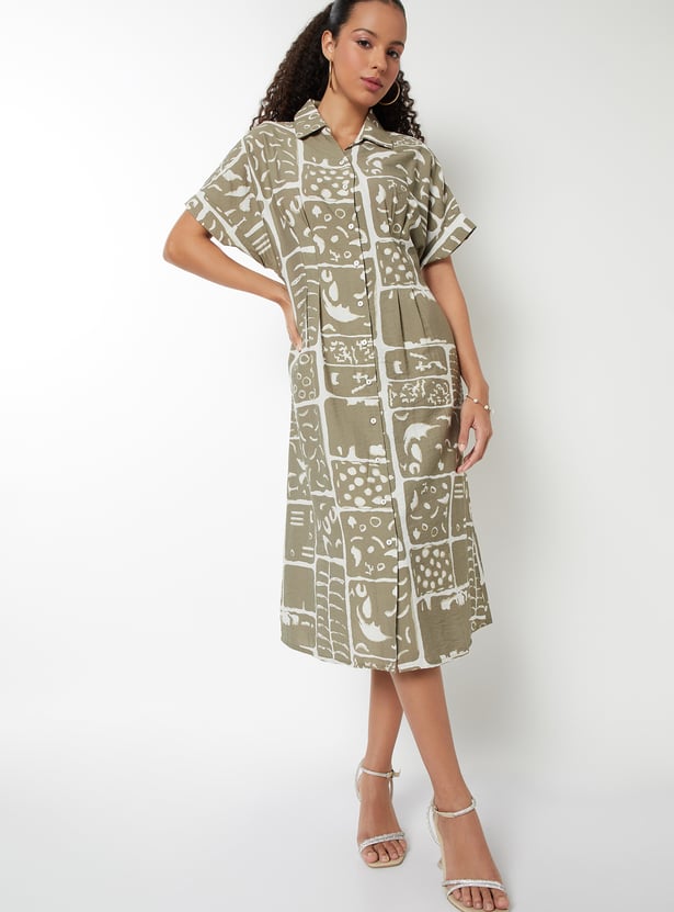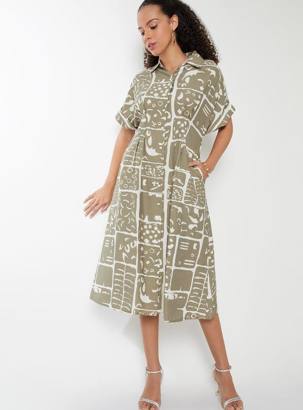 This printed A-line dress offers a perfect balance of structure and flow. It features a spread collar, button closure, half sleeves, and a flattering midi length for a timeless silhouette.