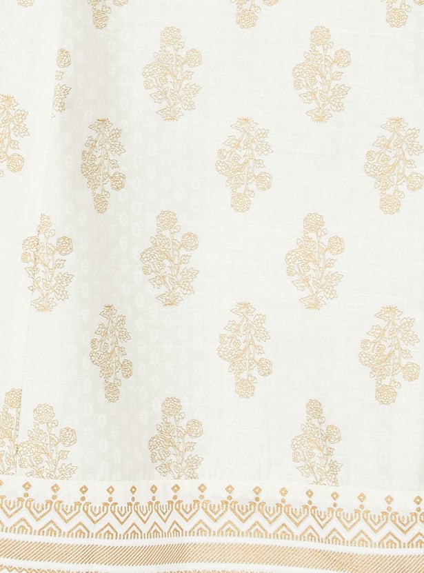 This printed A-line kurta features a flattering V-neck, 3/4th sleeves, and a flared hem for a graceful, feminine silhouette. The lively print adds charm and versatility to this timeless design.