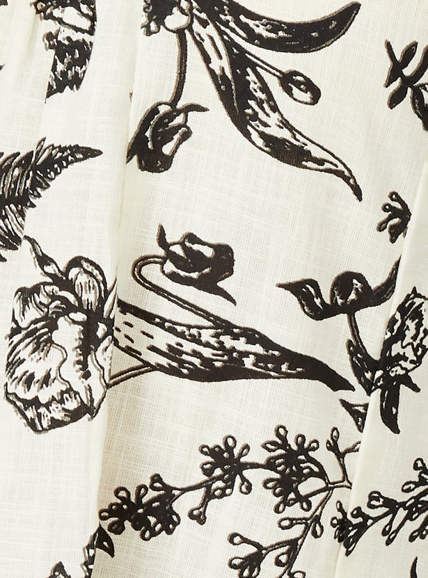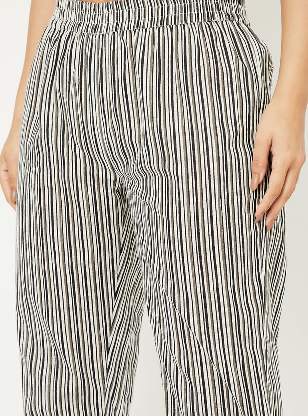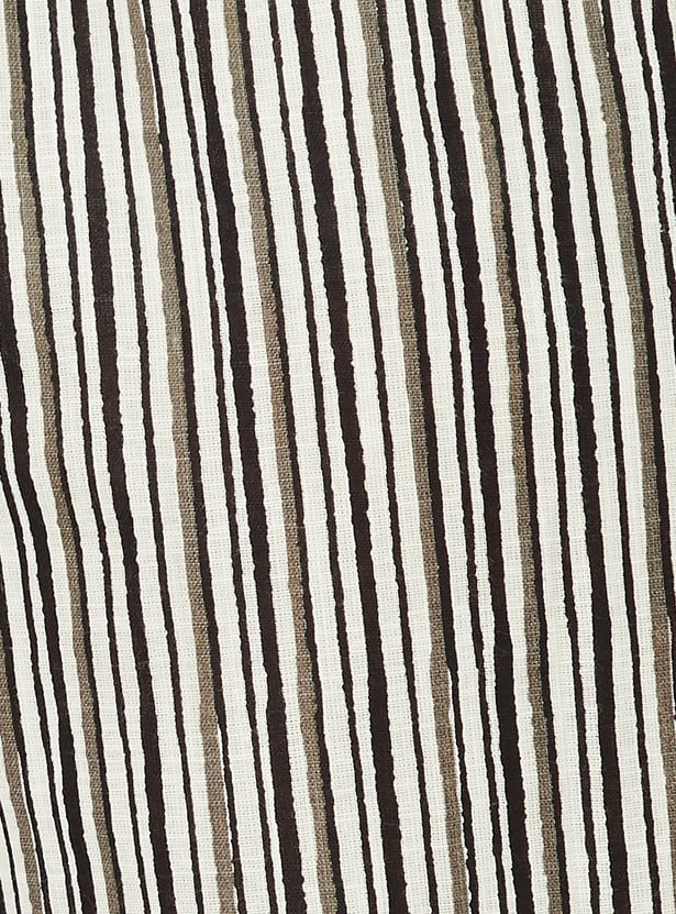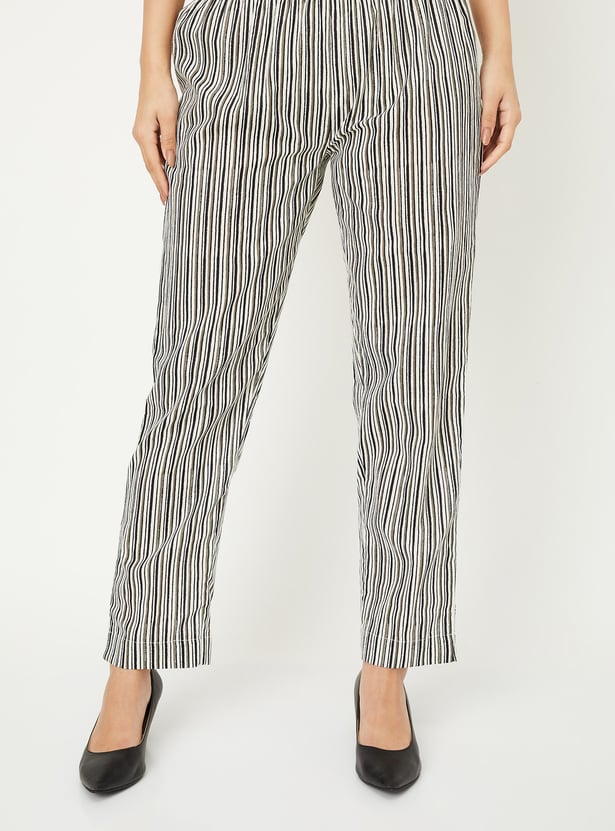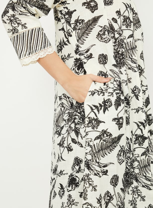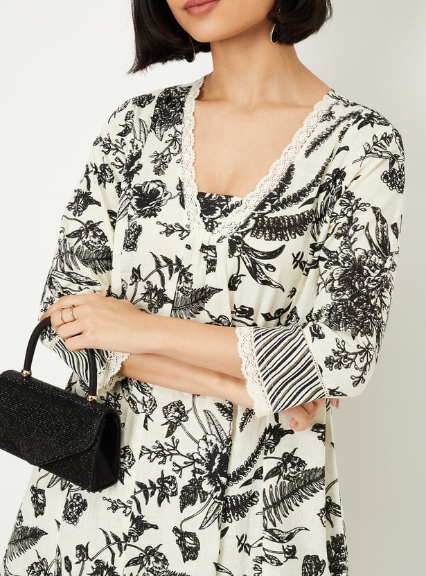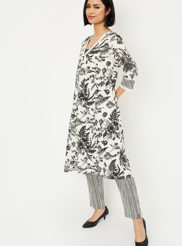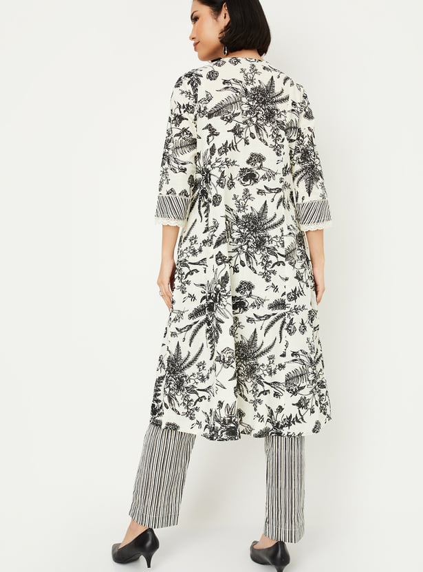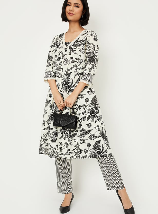 This printed kurta set features a printed kurta with a V-neck, 3/4th sleeves, lace trims, and an a-line cut, paired with elasticated waist, striped straight pants for a comfortable, flattering fit. The vibrant print adds a lively touch to the traditional design.