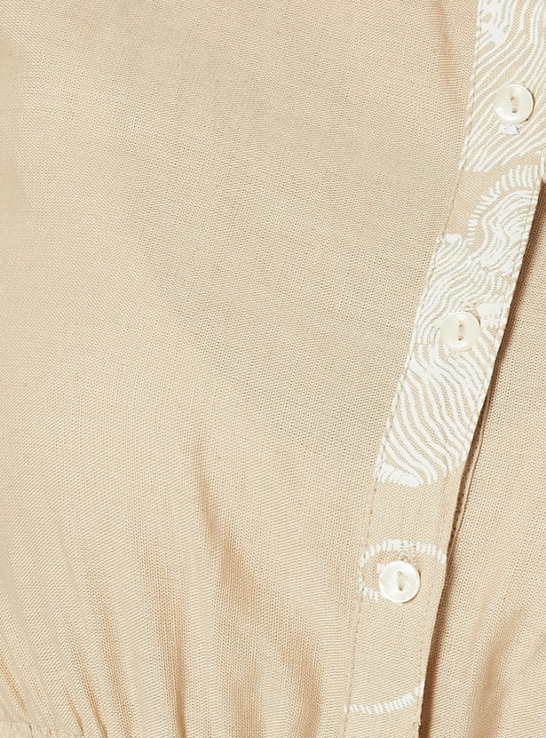 This printed A-line shirt dress features a button-down front, smocked waist, and spread collar for a structured yet feminine look. Finished with half sleeves and a convenient side pocket, it’s a perfect blend of comfort and style.