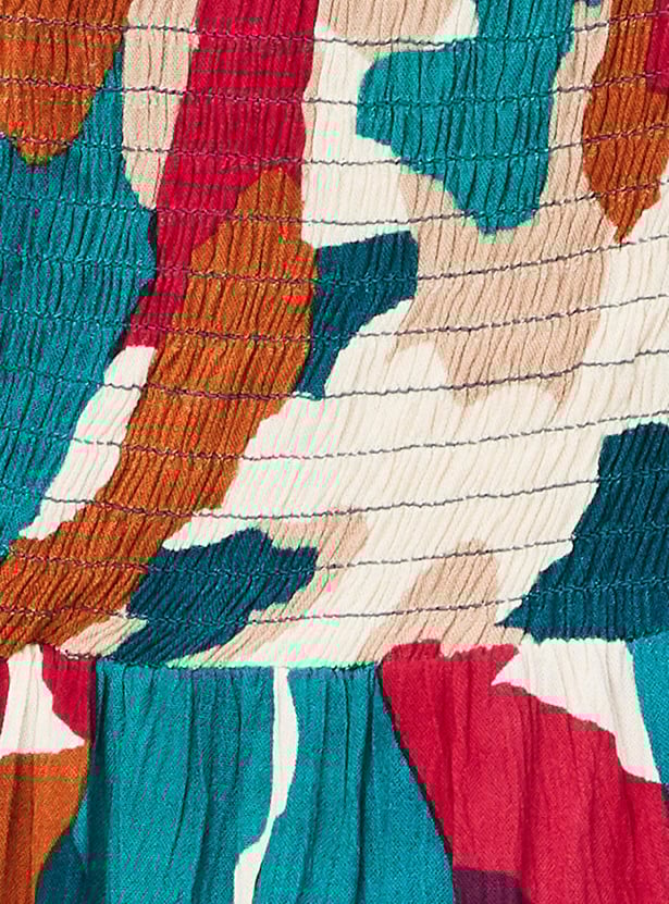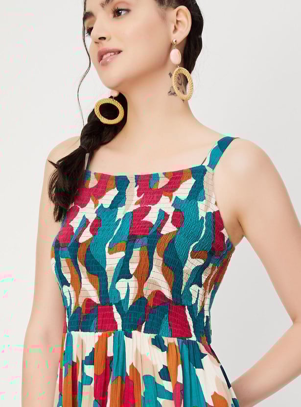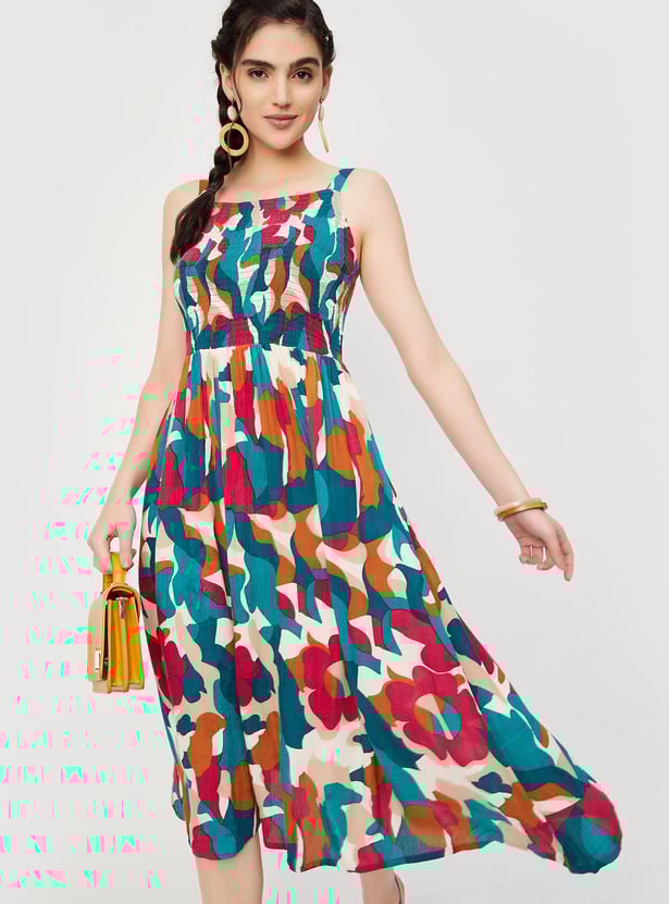 This printed dress is perfect for the summer. It has a smocked bodice, fit and flare silhouette, a sleeveless design, and adjustable straps. Put on this outfit and go for a city stroll while wearing sneakers.