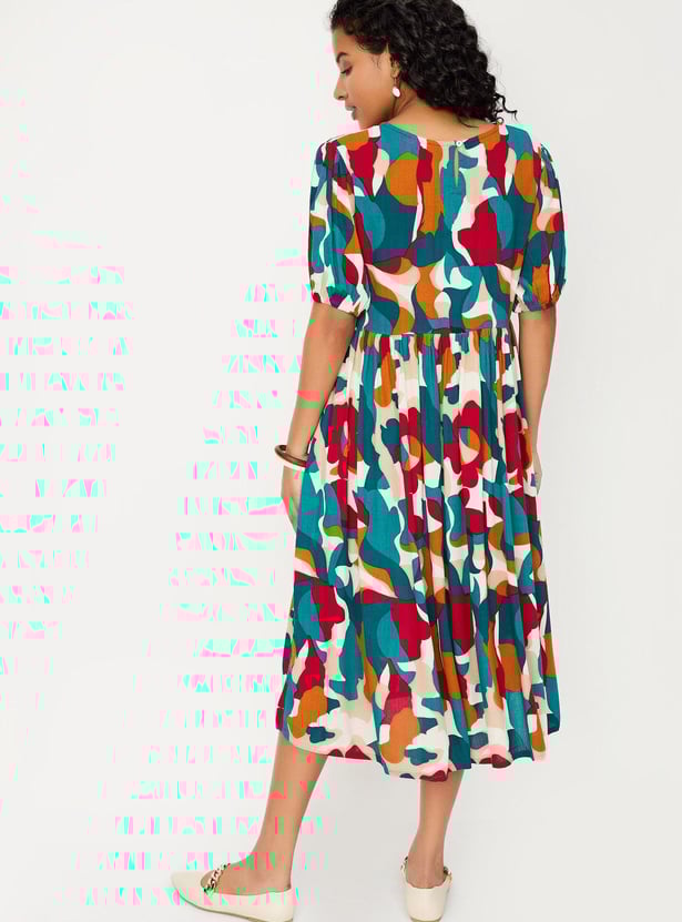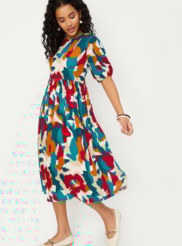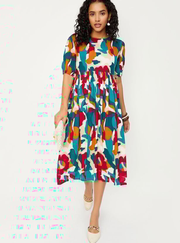This printed dress will add some flair to your casual collection. It has a round neckline with puff sleeves, pockets and midi-length construction. Style it with heels for an elegant look.