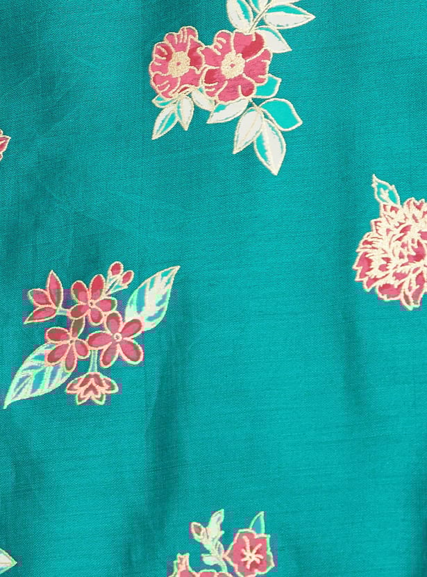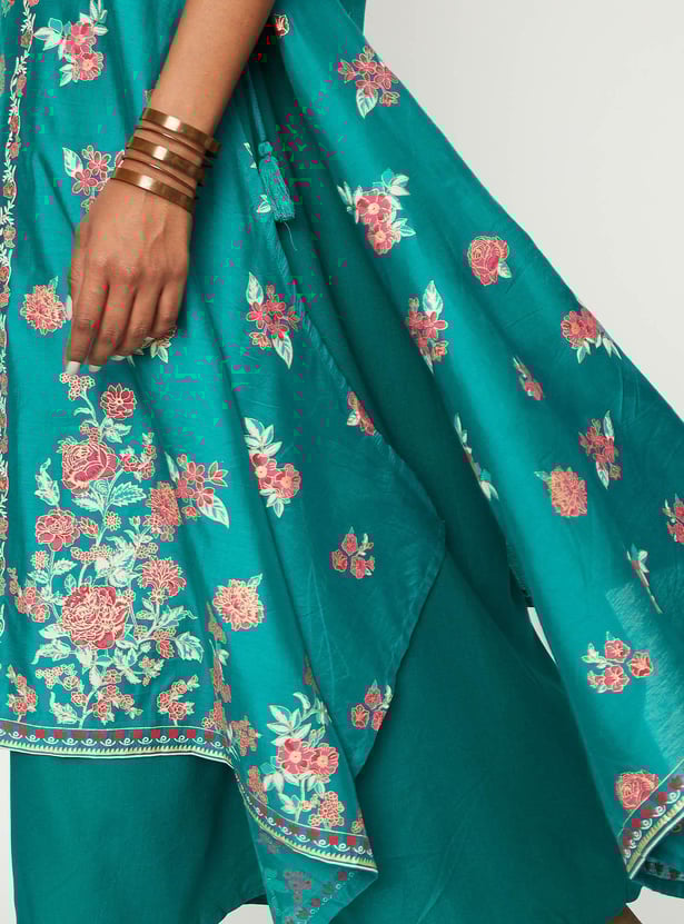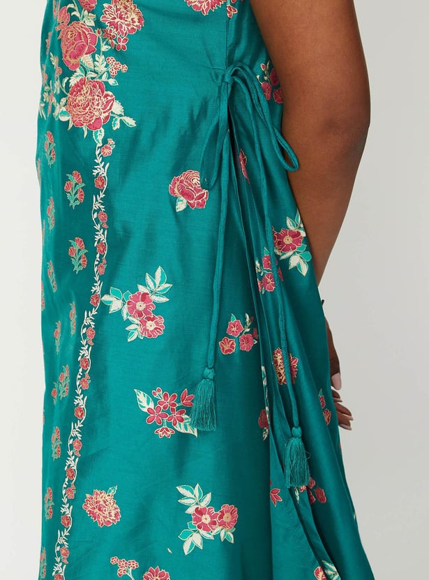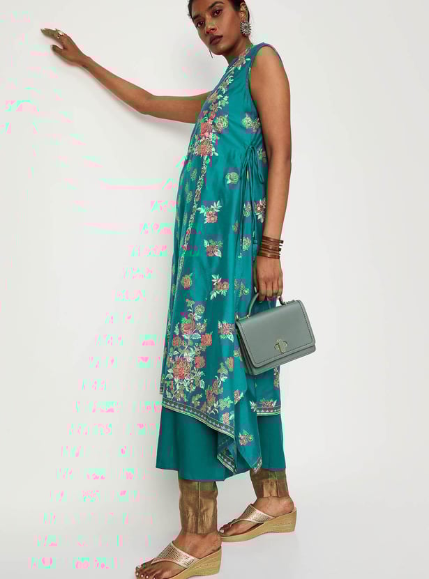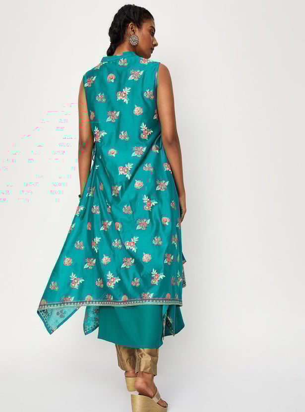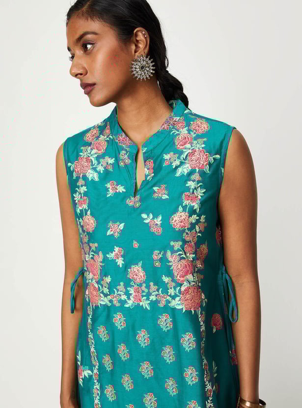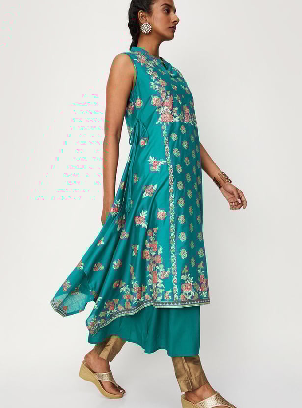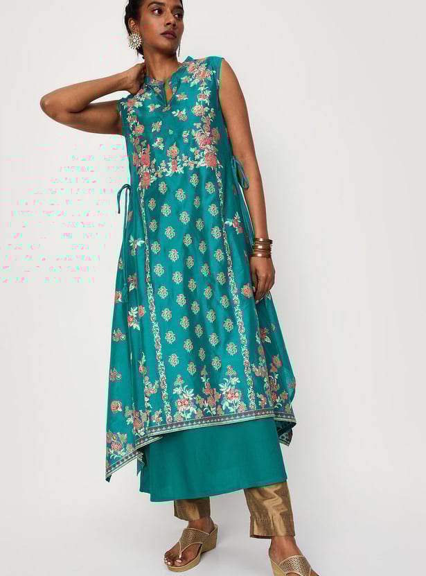 Paint a picture of elegance with this set featuring a solid inner kurta with an A-line profile, a round neckline and a sleeveless design. It is layered with a floral printed outer layered kurta with a band collar, sleeveless profile, tie-up at the sides, and an asymmetric hem. Style this kurta with straight pants and wedges for a refined look.