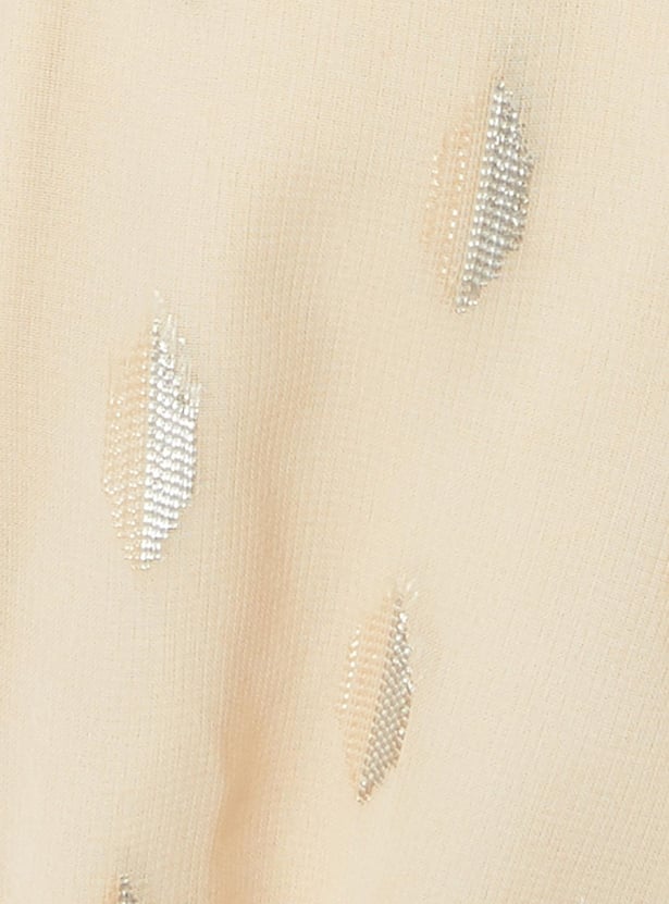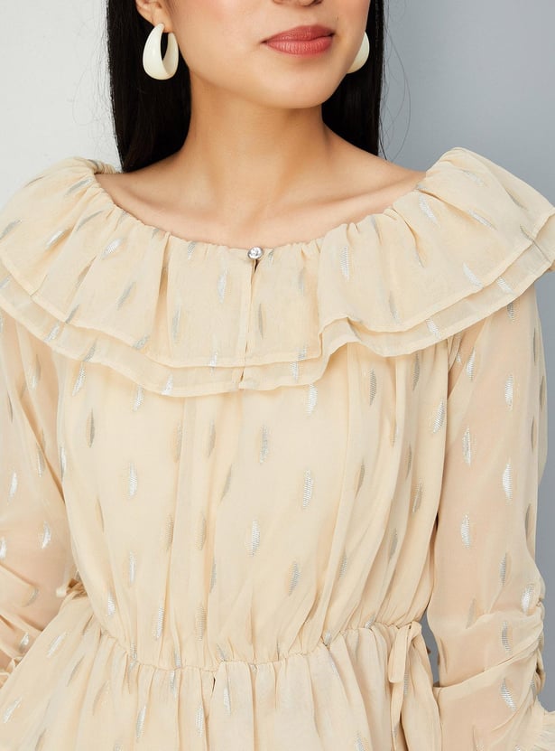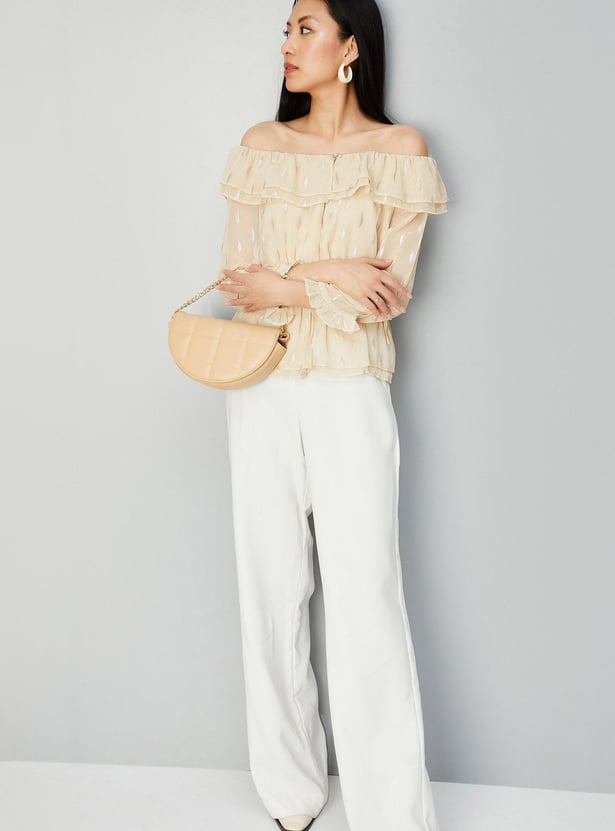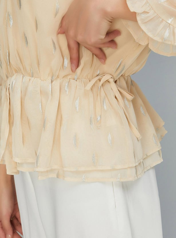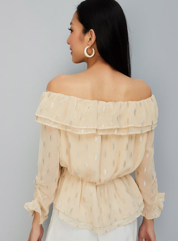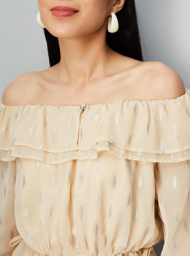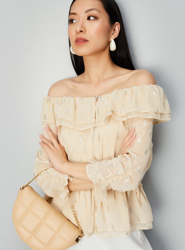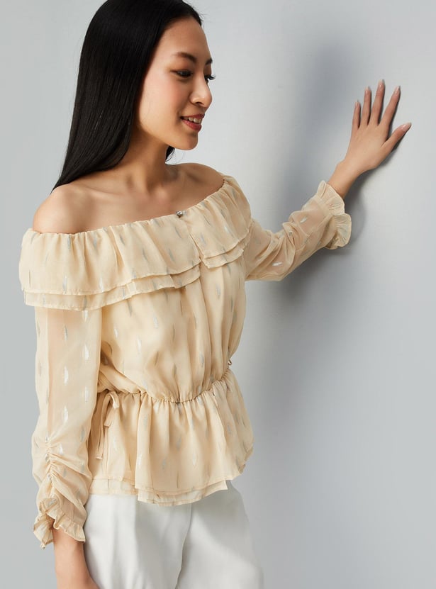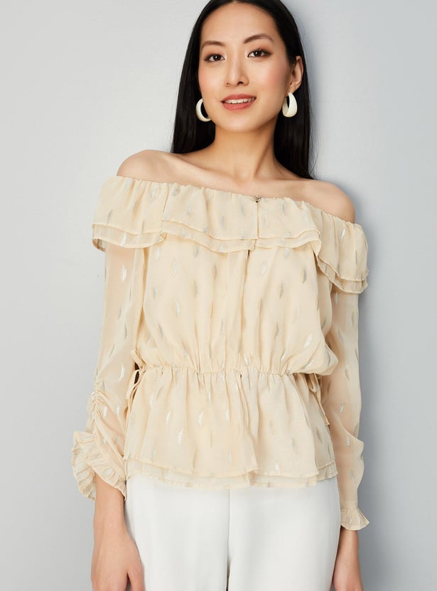 Add elegance to your everyday wardrobe with this top that is updated with all-over prints. It is designed with an off-shoulder neck, three-quarter sleeves, and a peplum hem. Complete the look by styling this top with a pair of trousers and stilettos.