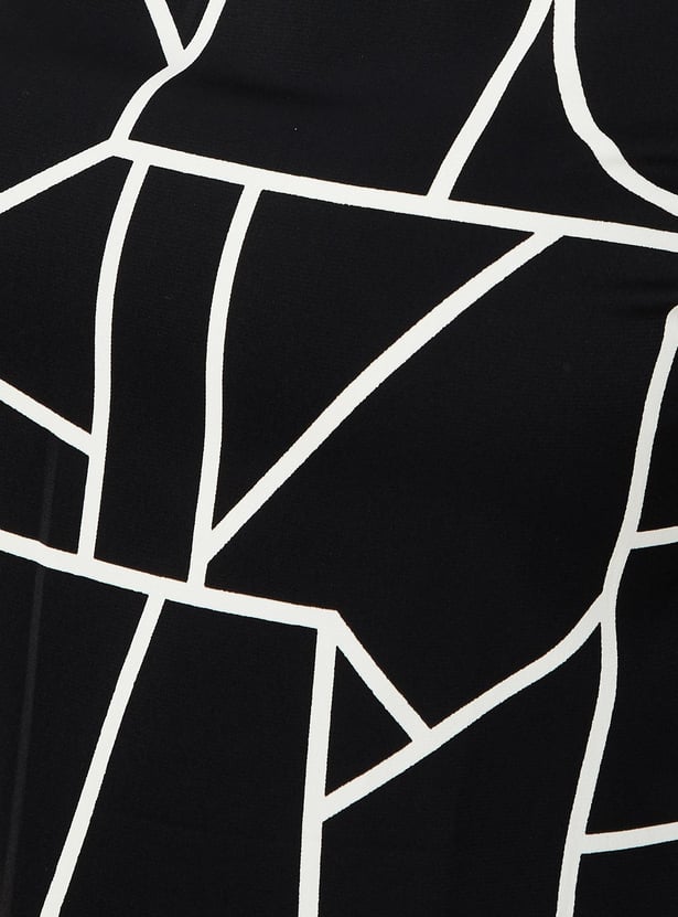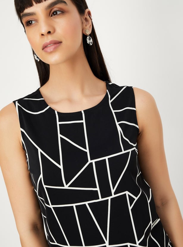 Look chic in this top highlighted with abstract prints. It has a round neck, sleeveless construction, and a curved hem.
