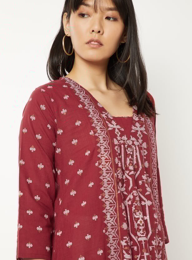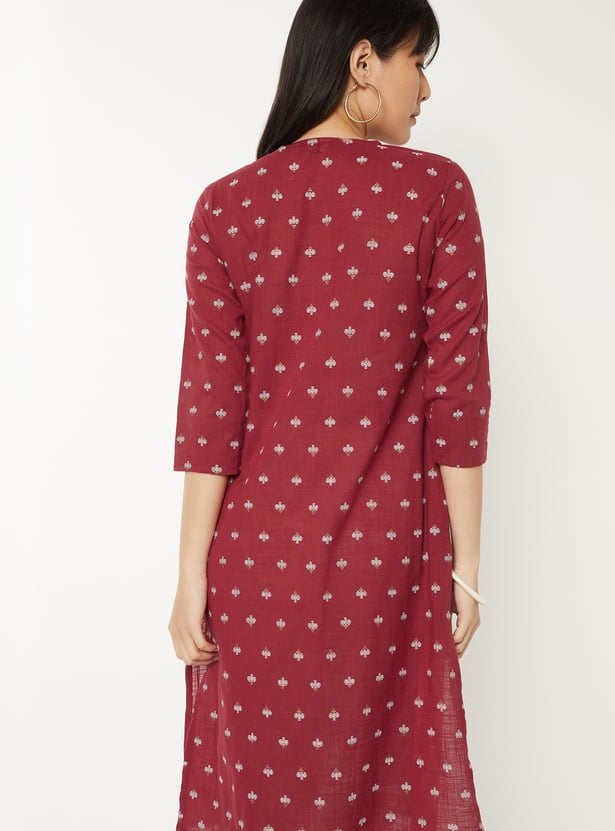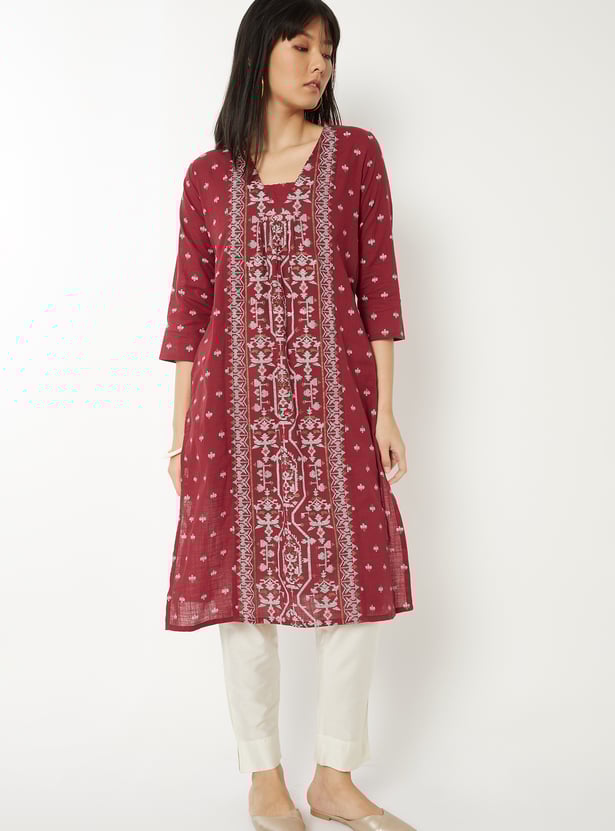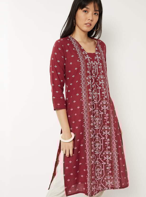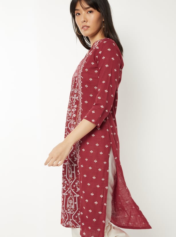 Elevate your ethnic wardrobe with this printed straight kurta, featuring intricate embroidery for a touch of elegance. The 3/4th sleeves and stylised neck offer a classic look, while the side slits add a modern twist for enhanced comfort and style.