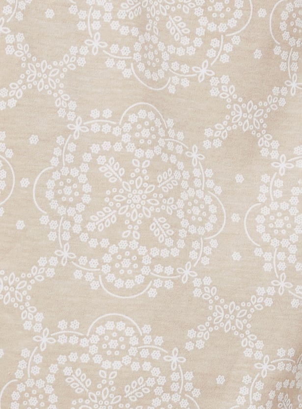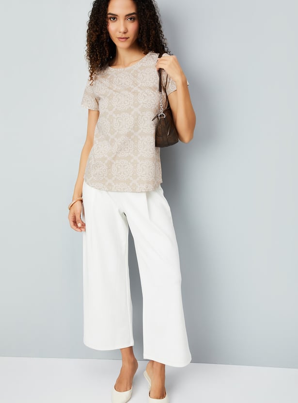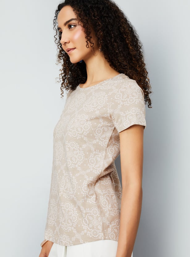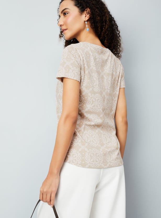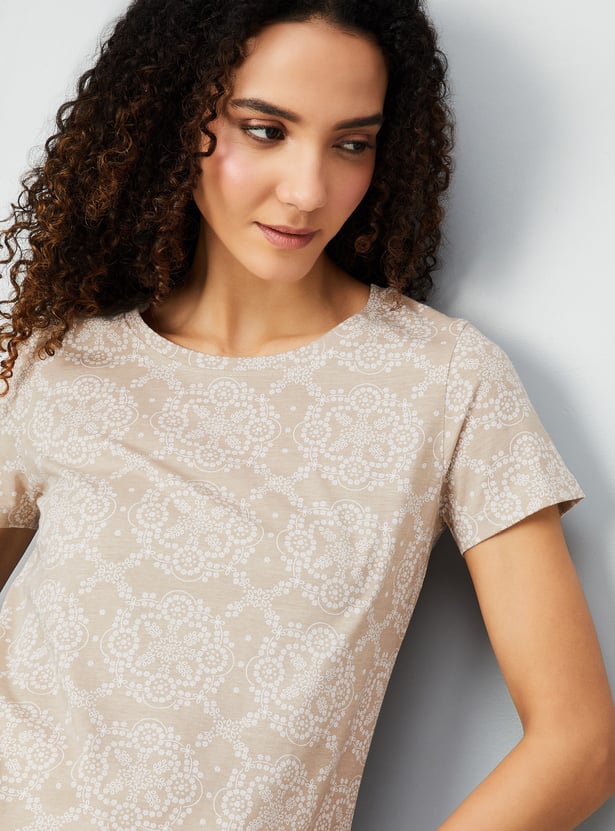 Switch up your style with this eye-catching T-shirt, designed with bold abstract prints for a striking look. Featuring a classic round neck and half sleeves, it is perfect for casual outings. Model Size :