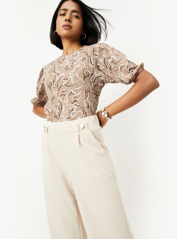 Add a touch of charm to your wardrobe with this printed top, featuring a classic round neck and stylish puff sleeves. Crafted for comfort and flair, it’s perfect for both casual outings and weekend plans. Model Size :