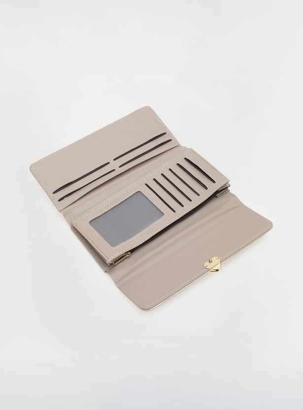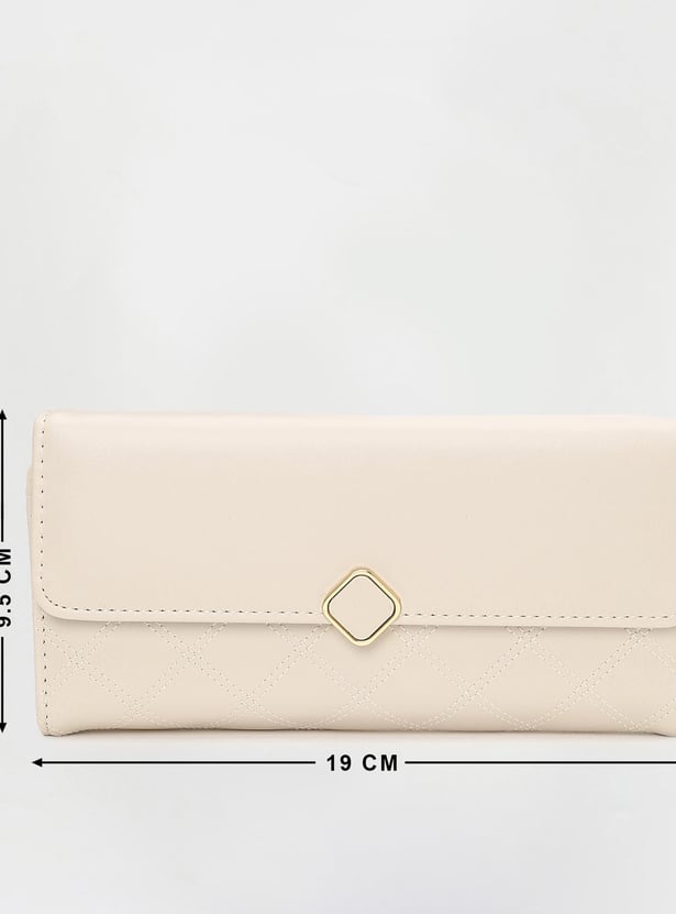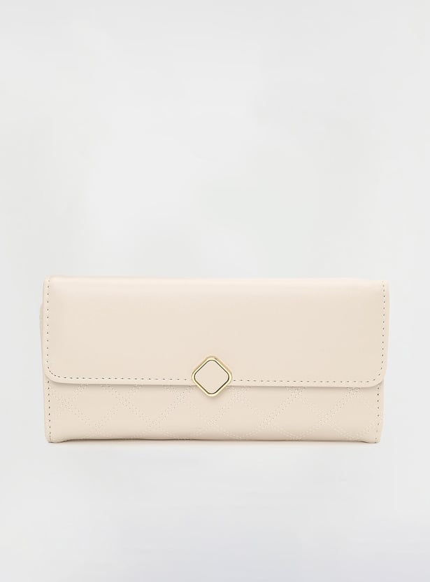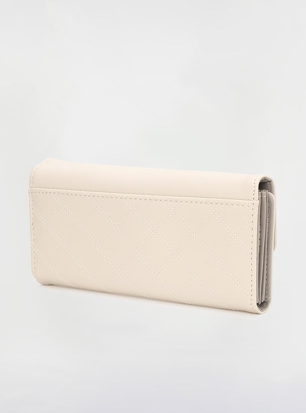 This tri-fold wallet emphasises elegance in your accessory collection with its quilted design and snap button closure. The spacious compartment and card slots provide space for your needs.