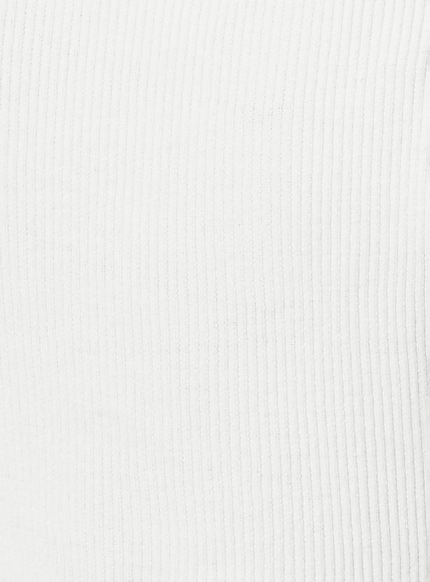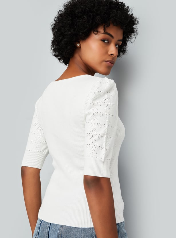 Build your basic wardrobe with this top, featuring a rib-knit design and a v-neckline with a zip closure. Its puffed half sleeves add a touch of sophistication, making it a versatile and stylish addition to your collection.