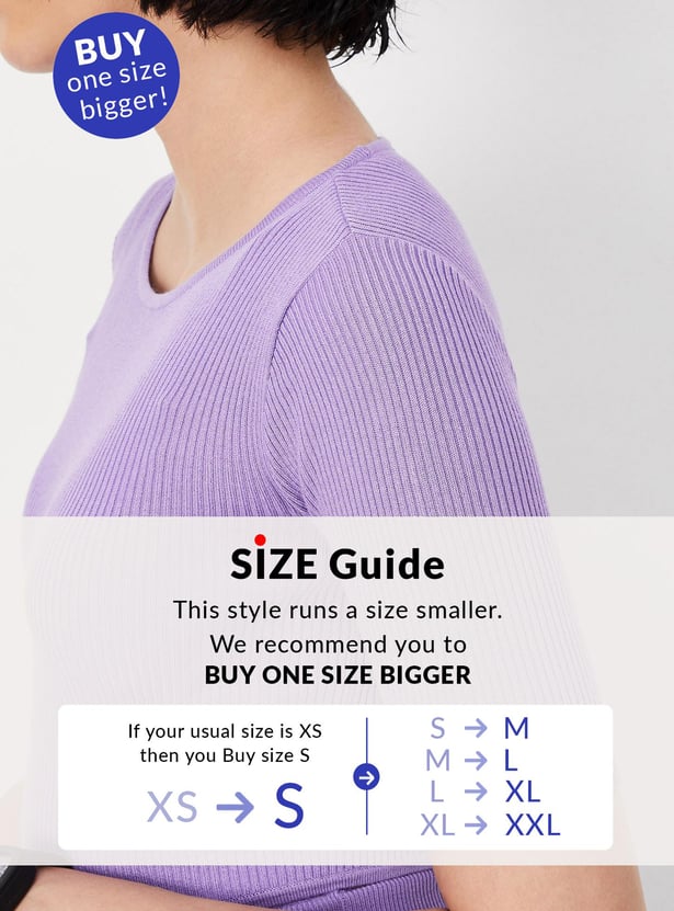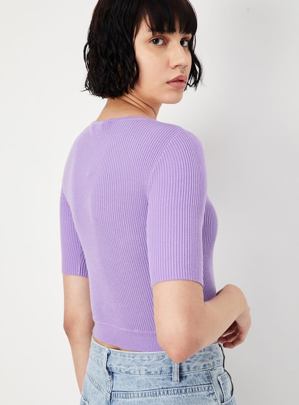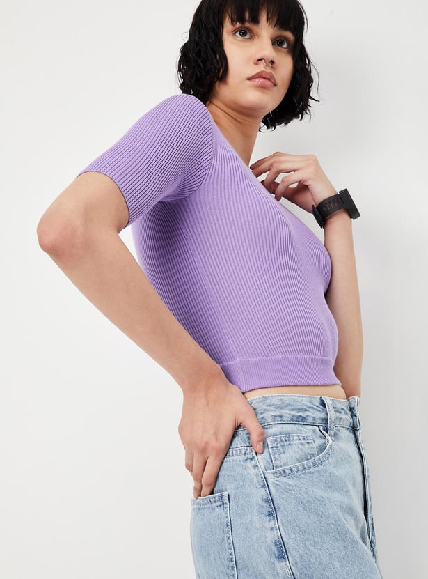 Give a makeover to your wardrobe with this trendy and stylish crop top. It is designed with a ribbed surface, round neckline, and half sleeves. Team it with a pair of jeans and heels to make your outfit look elegant.