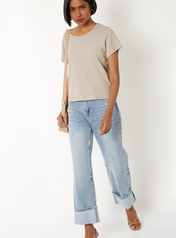 Add a timeless touch to your wardrobe with this ribbed T‑shirt, designed for effortless everyday style. Crafted with a classic round neckline and half sleeves, this ribbed T‑shirt is made from soft, breathable fabric to keep you comfortable while looking chic.