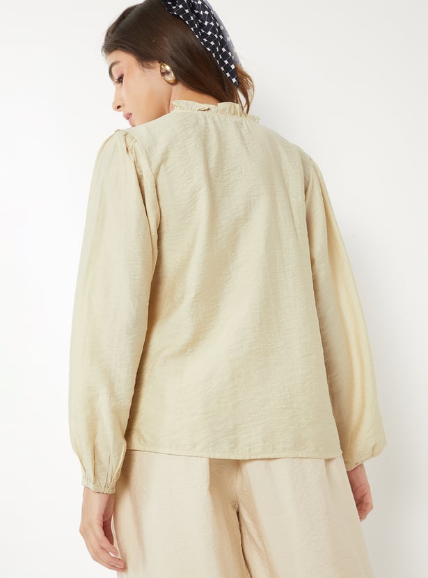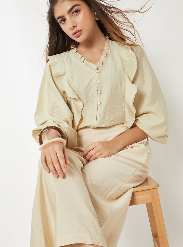 Feminine and chic, this ruffles blouse is designed with a flattering V-neck, button closure, and full sleeves. The ruffle detailing adds a touch of elegance and playfulness, making it perfect for both casual and semi-formal occasions.