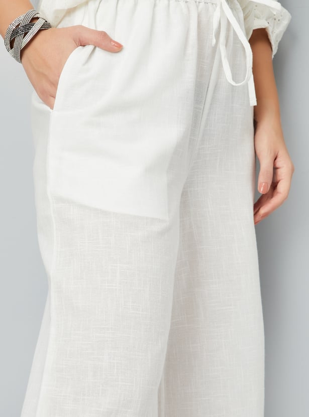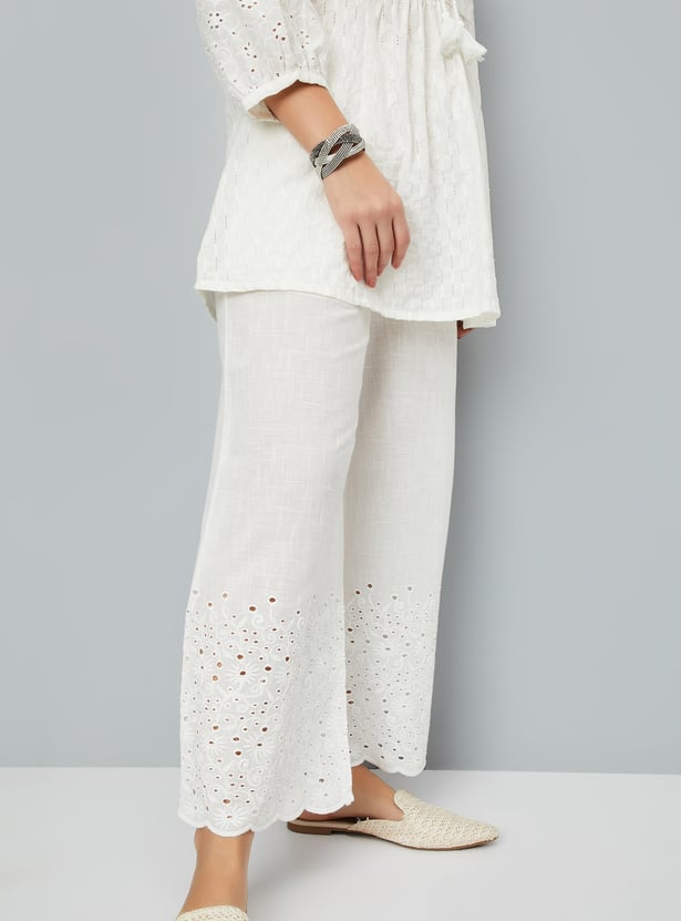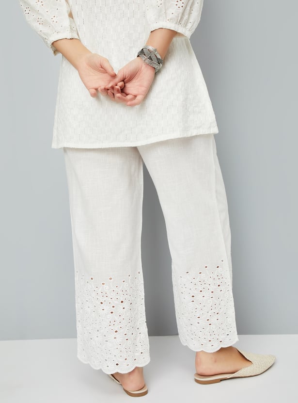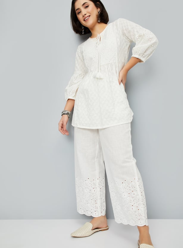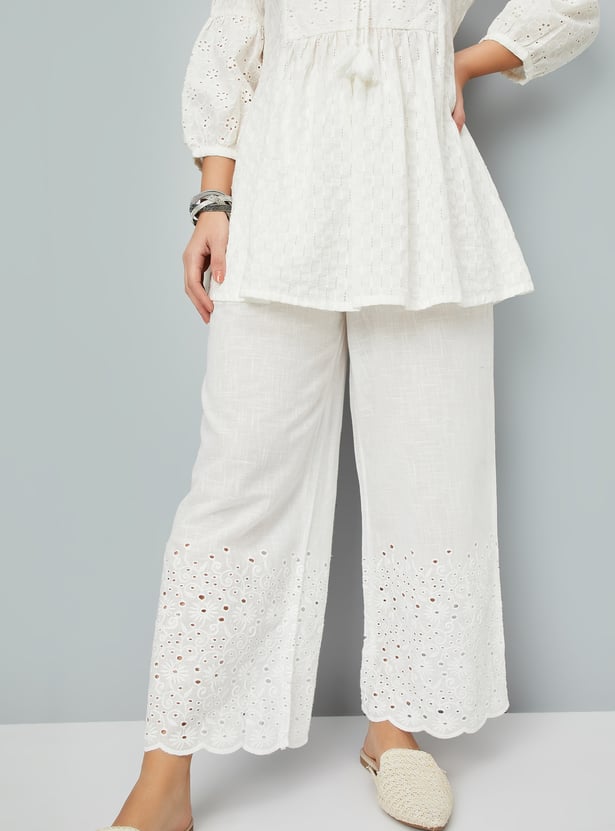 These Schiffli embroidered palazzos feature intricate embroidery and elegant scallop trims, adding a refined touch to the breezy silhouette. Designed with an elasticated waist and drawstring closure, they ensure a comfortable, adjustable fit for all-day wear.