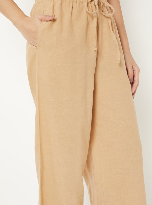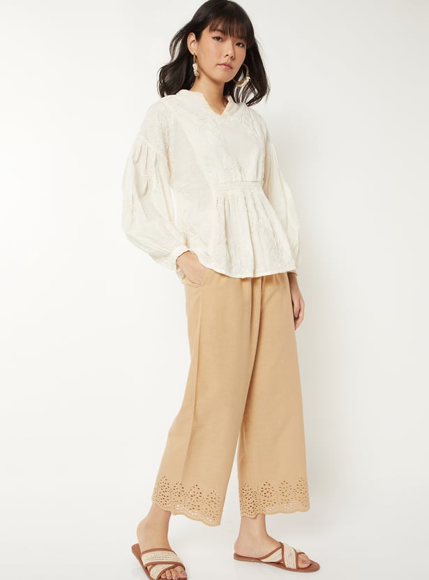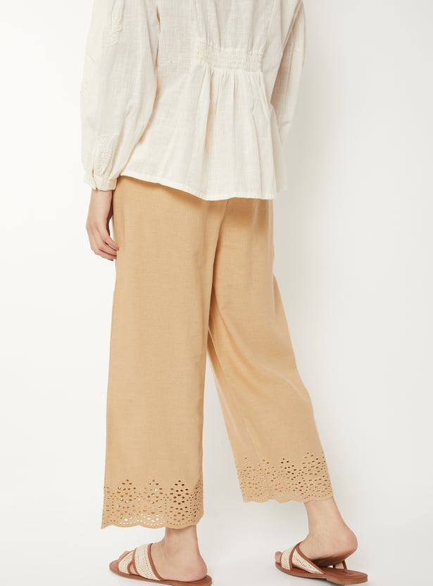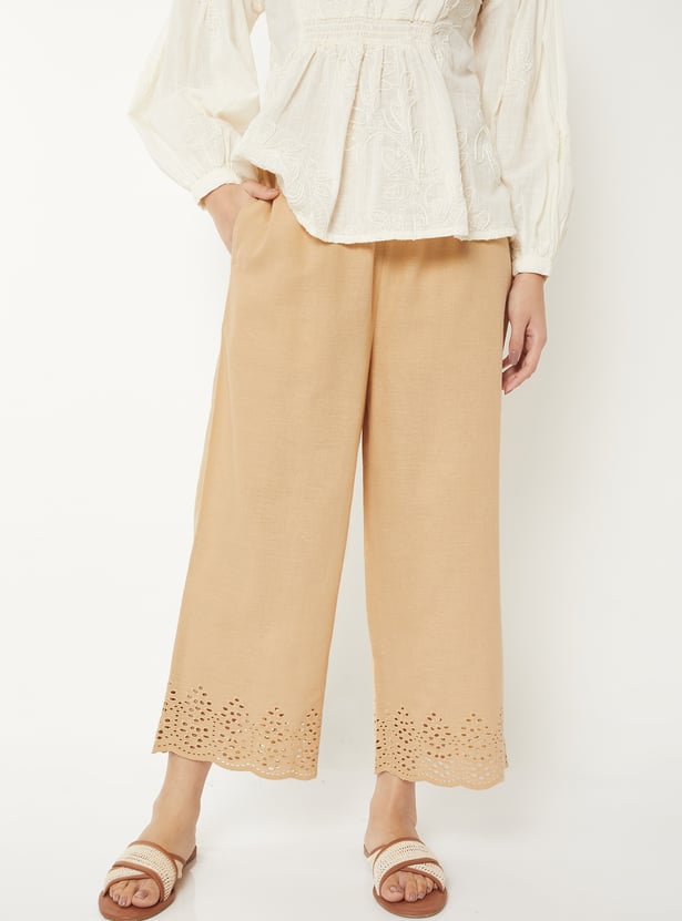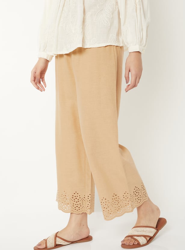Add a touch of elegance to your wardrobe with these Schiffli hem palazzos, crafted with intricate detailing at the hem. Designed with a comfortable drawstring closure and pockets, they combine effortless style with everyday ease.