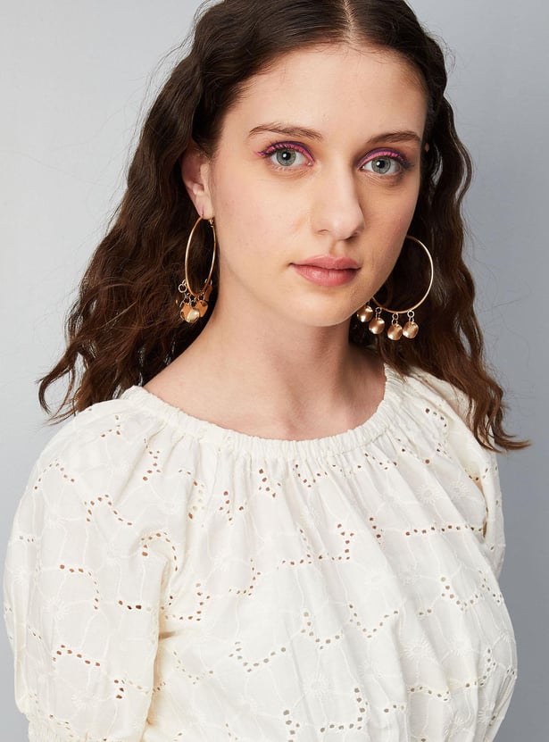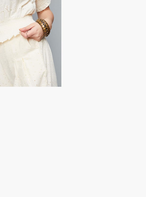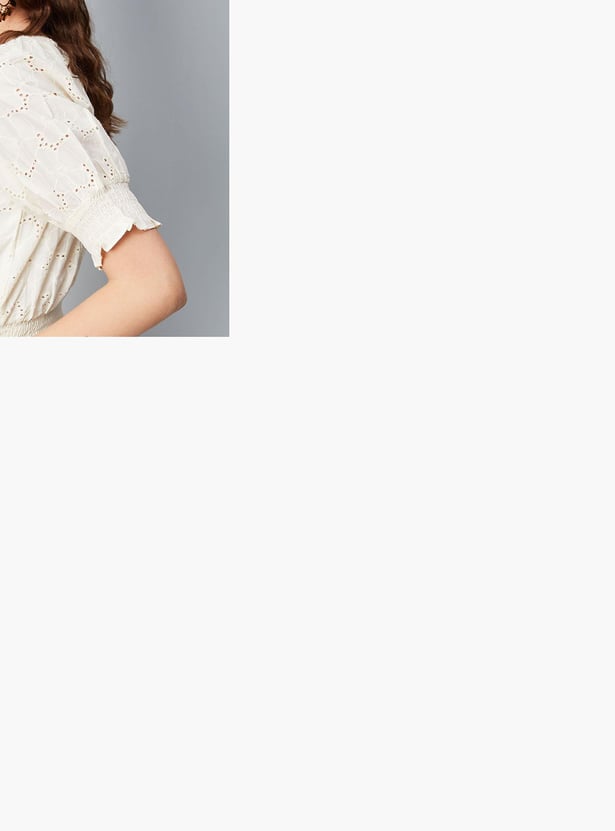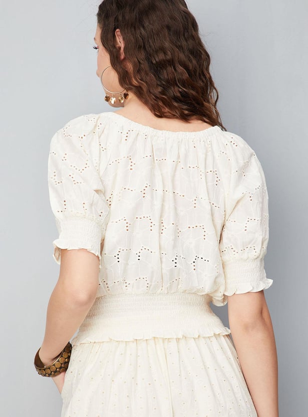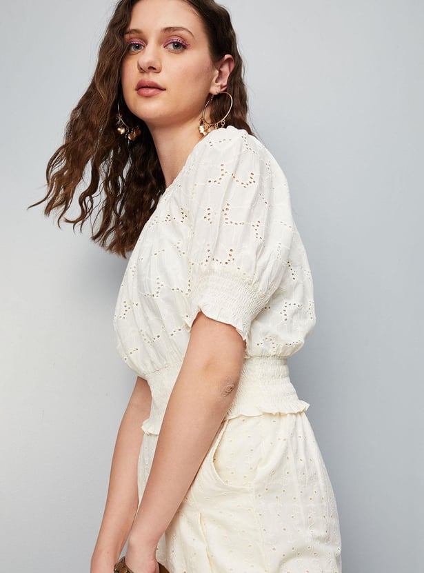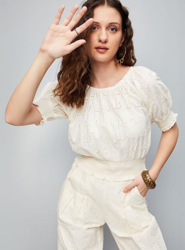 Make a chic statement in this crop top with schiffli embroidery. It is designed with a round neck, raglan sleeves, and a smocked hem. Pair this top with ethnic pants and sneakers for an elegant look.