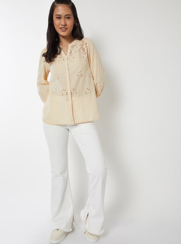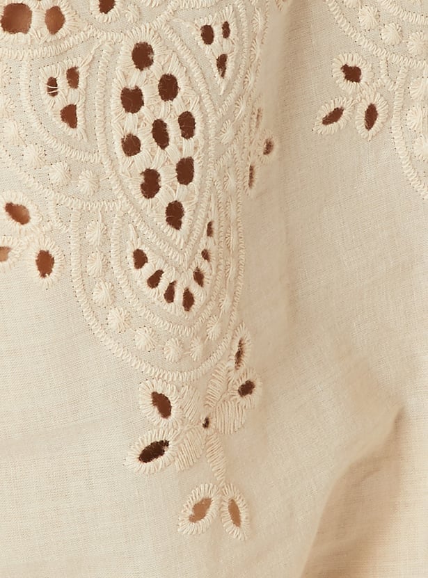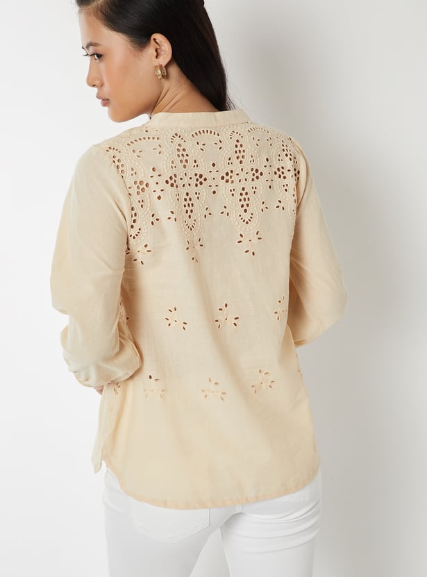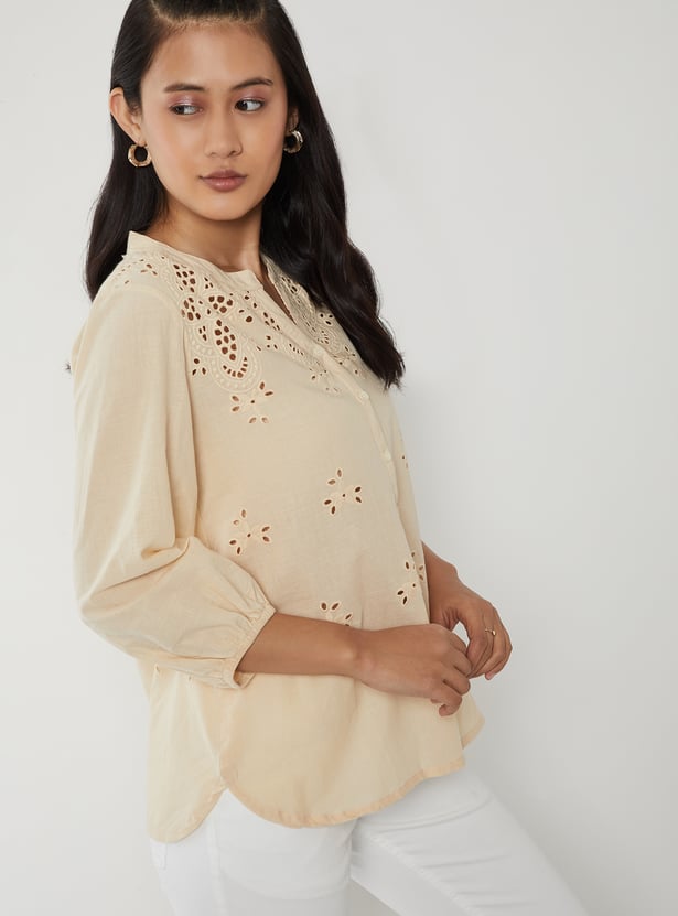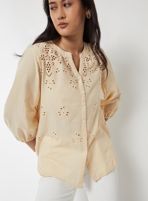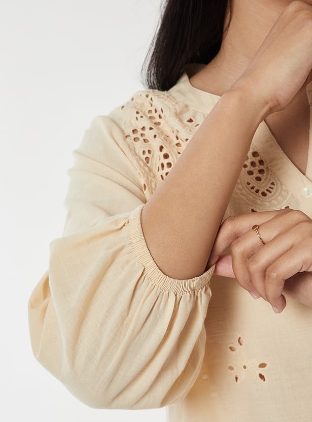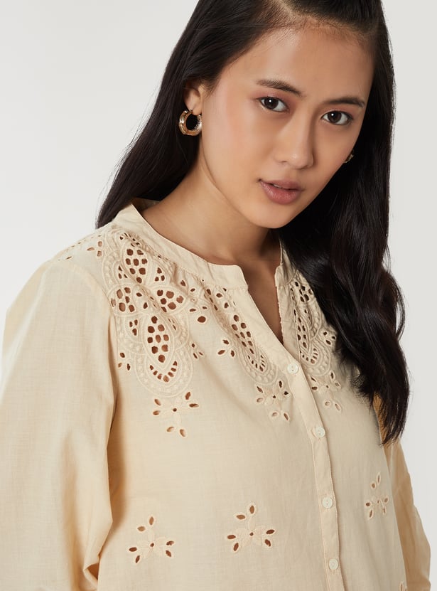 Elevate your fusion collection with this tunic, showcasing exquisite schiffli embroidery, a band collar, and three-quarter sleeves. Featuring front buttons and a curved hem, it beautifully blends elegance with contemporary flair.