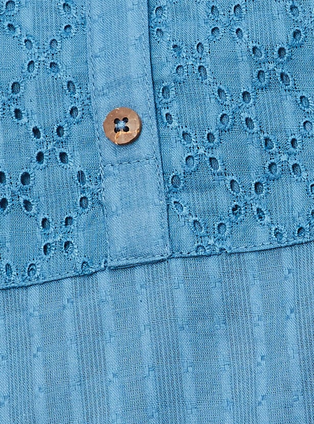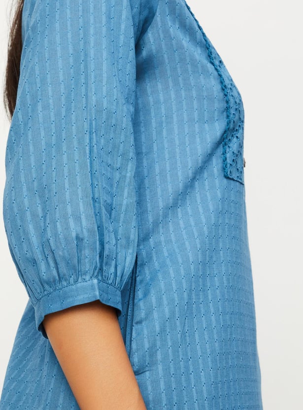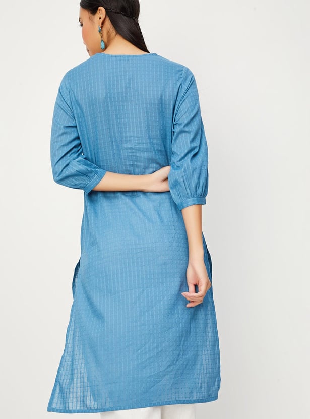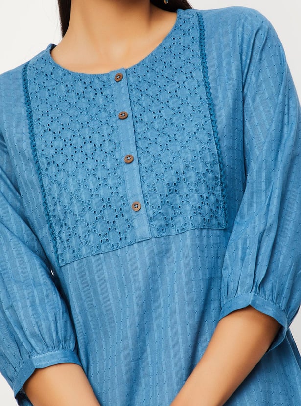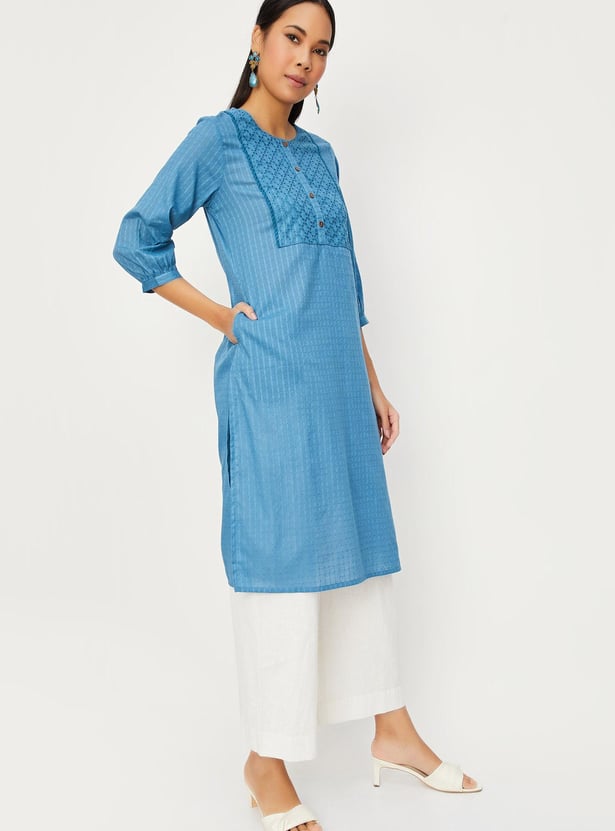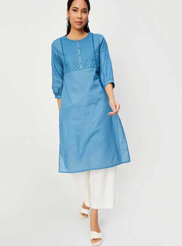 Flaunt your style with this straight kurta is designed with a schiffli detailed on the yoke, a round neck with a button placket, three-quarter sleeves, and knee-length construction. Team this kurta with a pair of palazzos and flats to make your outfit look complete and elegant.