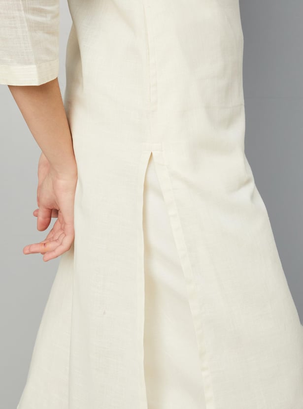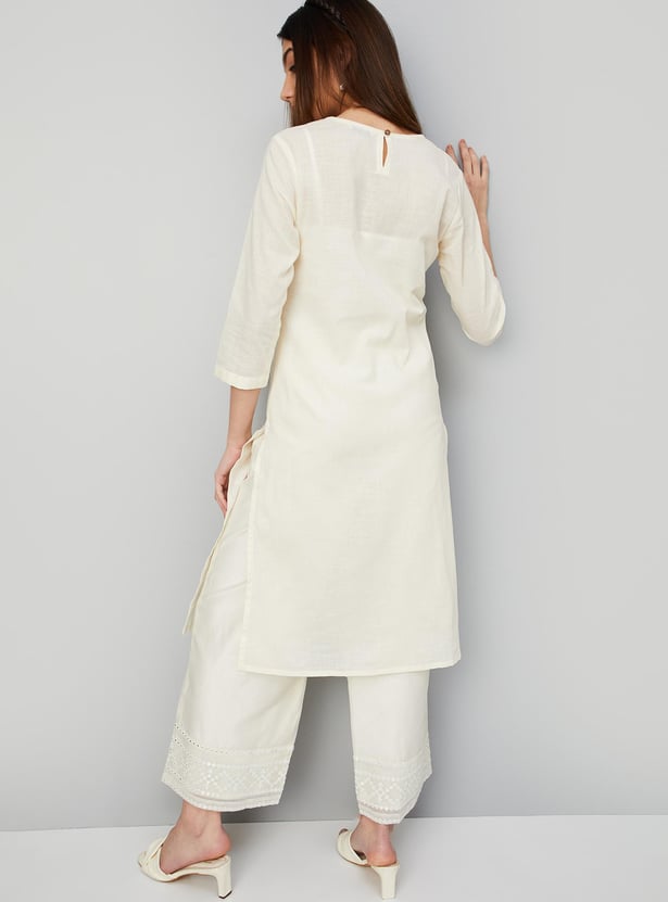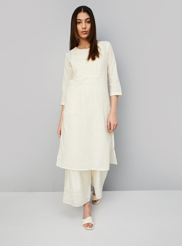 Paint a picture of elegance with this straight kurta highlighted with an embroidered yoke. It has a round neck, three-quarter sleeves, and a waist pocket.
