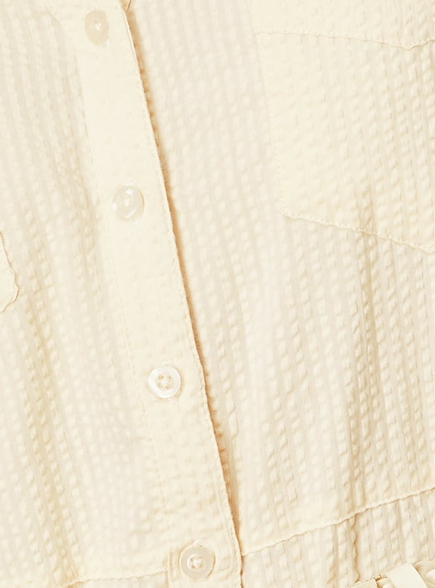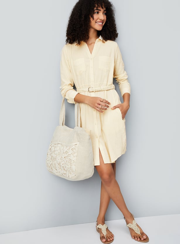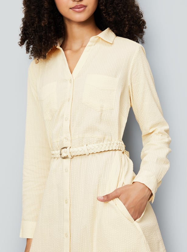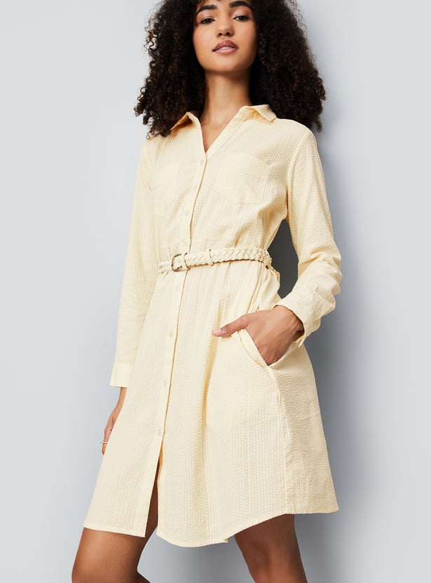 Breezy and effortlessly stylish, this seersucker shirt dress features a spread collar, full sleeves, and a button placket. The belted waist and patch pockets add a structured touch to its relaxed vibe. Model Size :