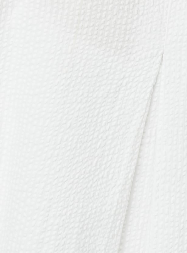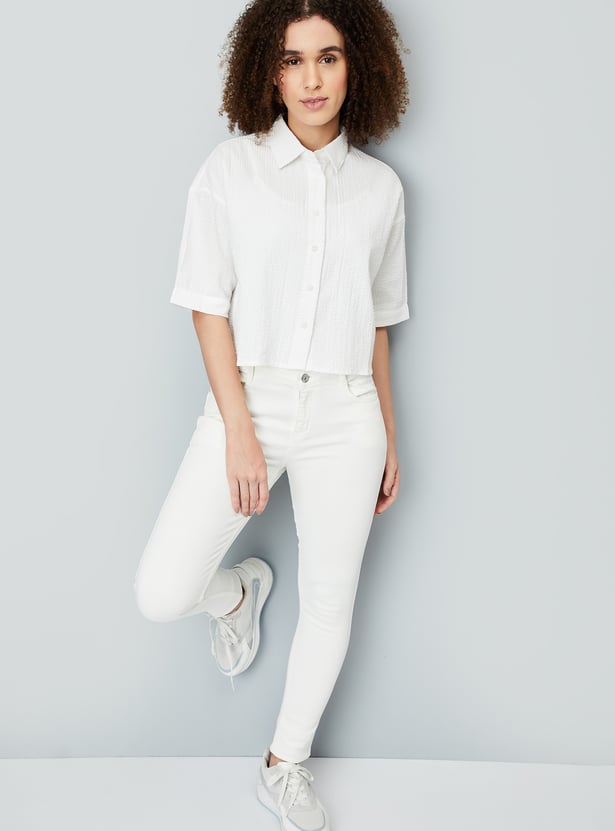 Elevate your wardrobe with this cropped shirt, designed with a spread collar and half sleeves for a touch of elegance. The lightweight seersucker fabric and trendy cropped silhouette make it a perfect choice for casual outings or warm-weather styling.