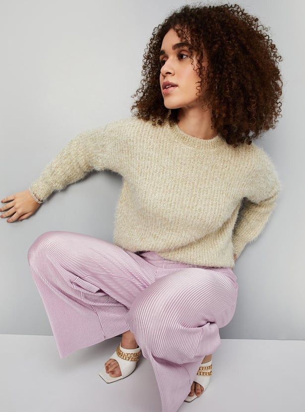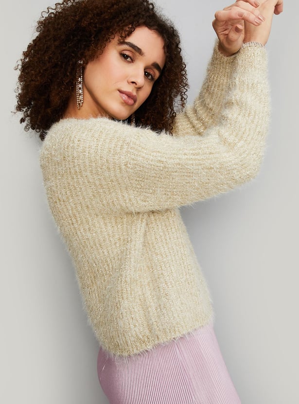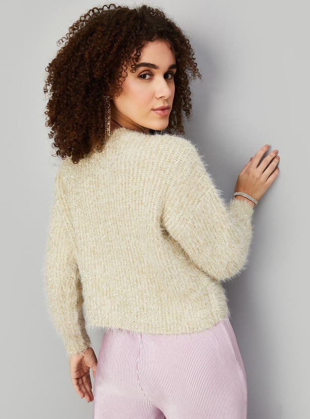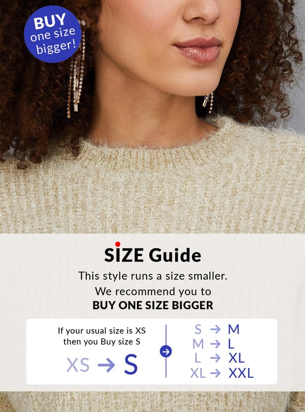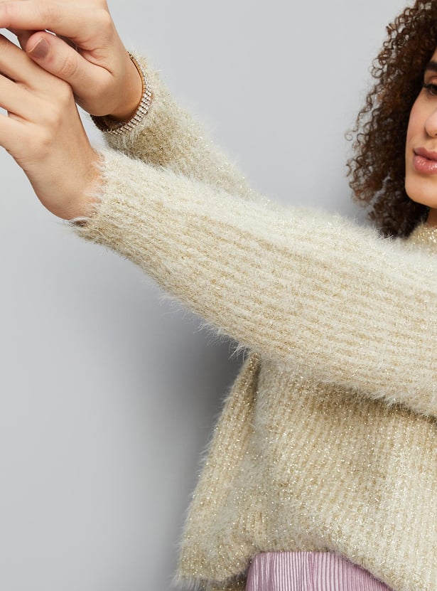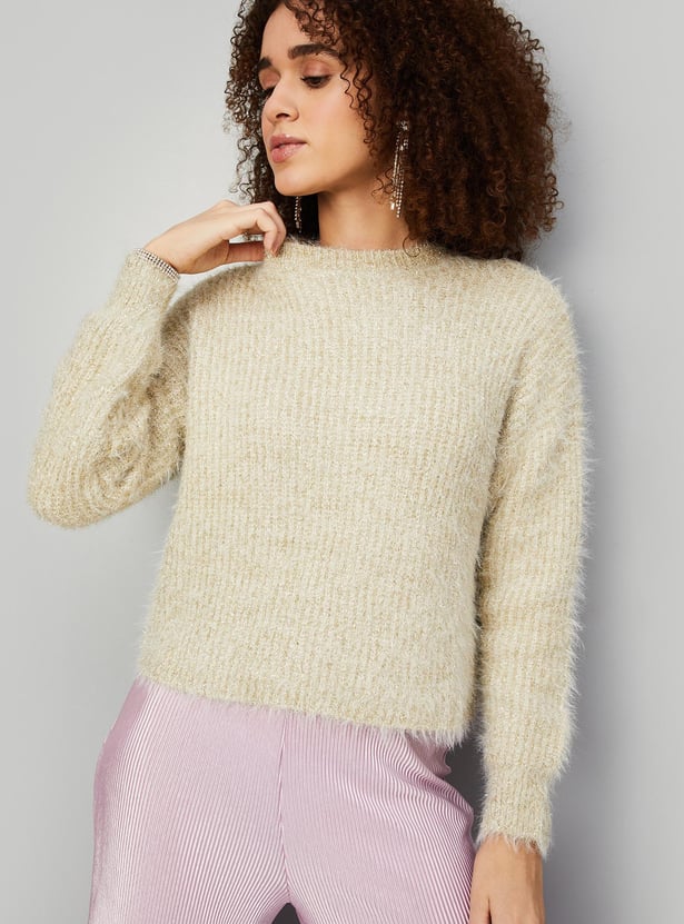 Elevate your wardrobe with this fashionable shimmery sweater, which has a round neck, full sleeves, and drop shoulders. Style it with a pair of jeans and other accessories.