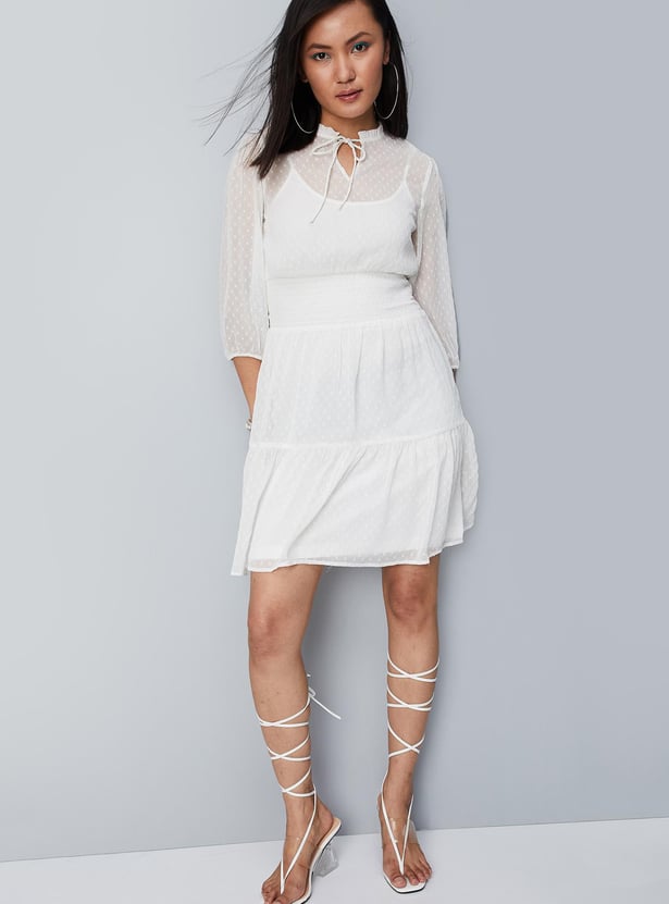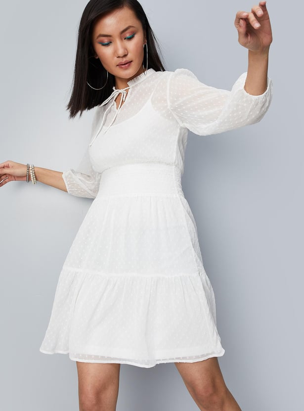 Slay the casual collection with this blouson dress with a lining. It flaunts a smocked surface, tie-up neck, three-quarter sleeves, and a mini silhouette. The lining comes with a solid surface, a round neck, and a sleeveless construction. Team it up with a pair of boots to make a statement.