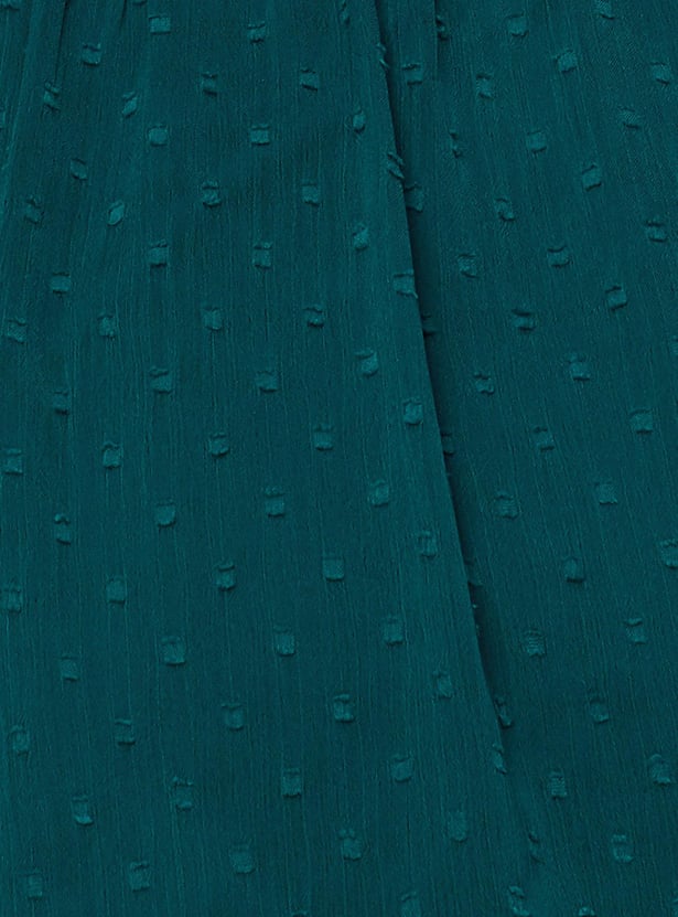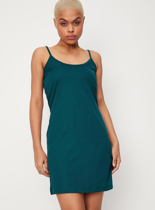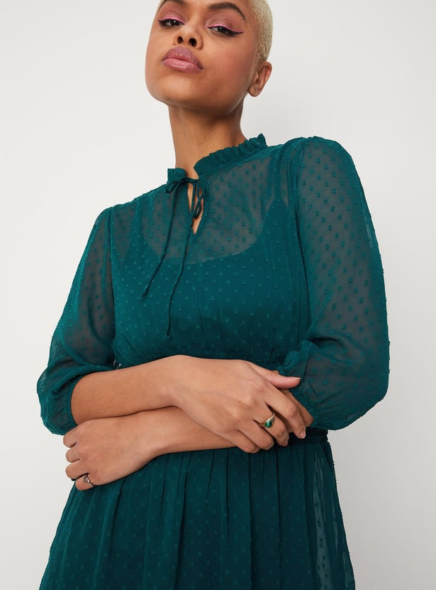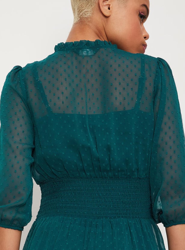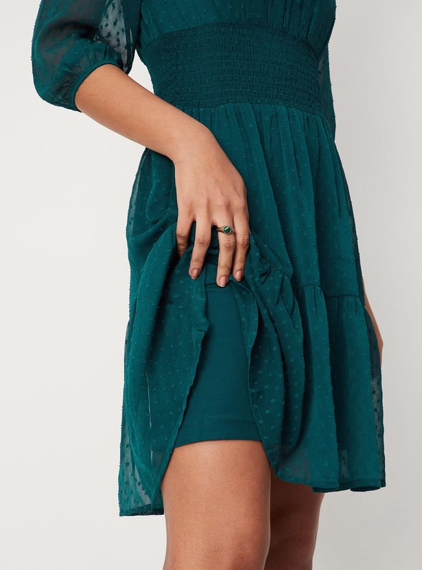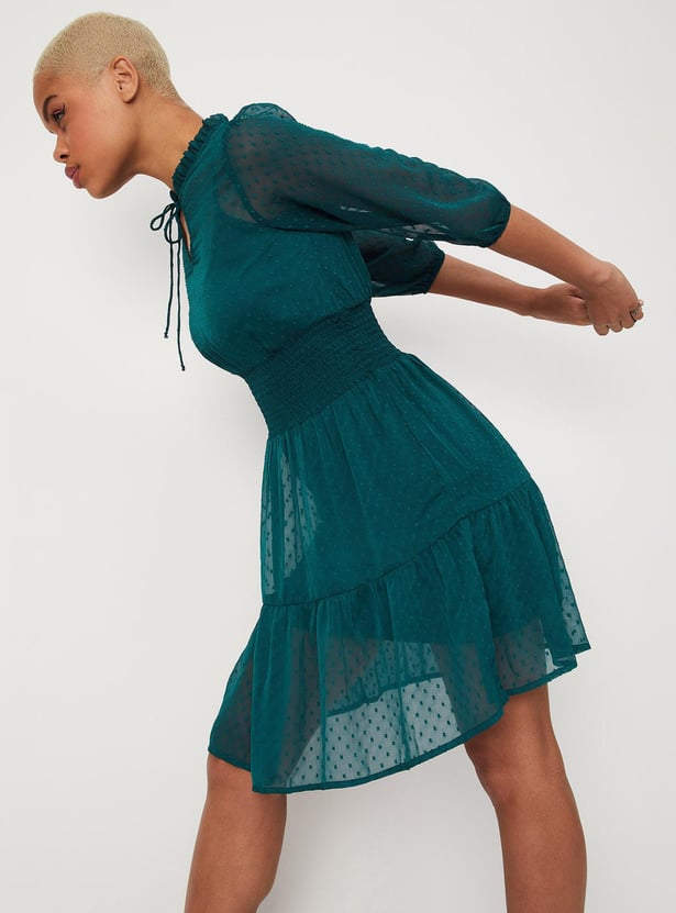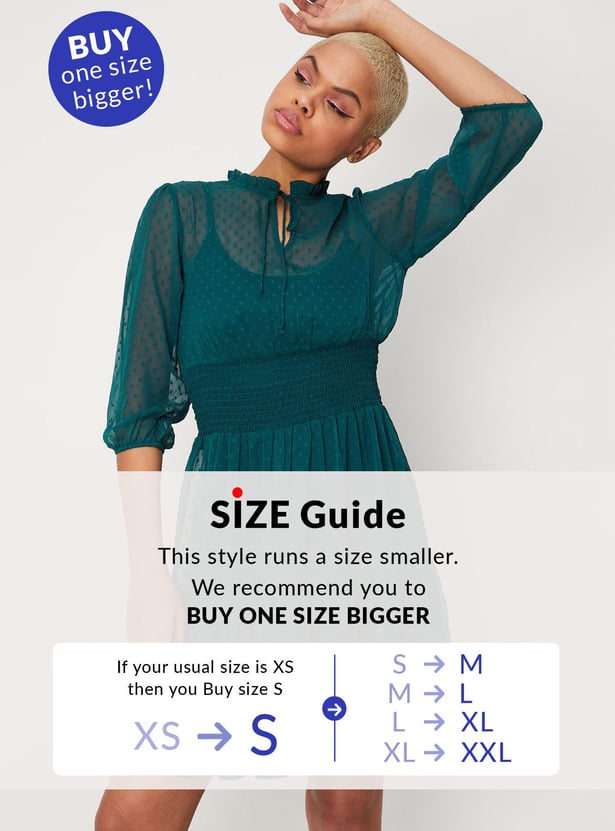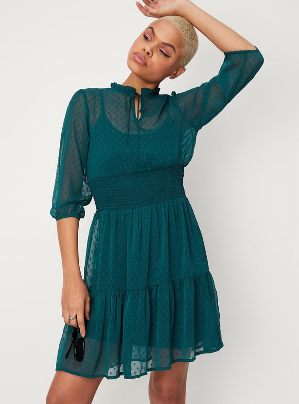 Slay the casual collection with this blouson dress with a lining. It flaunts a smocked surface, tie-up neck, three-quarter sleeves, and a mini silhouette. The lining comes with a solid surface, a round neck, and a sleeveless construction. Team it up with a pair of boots to make a statement.
