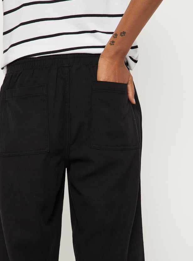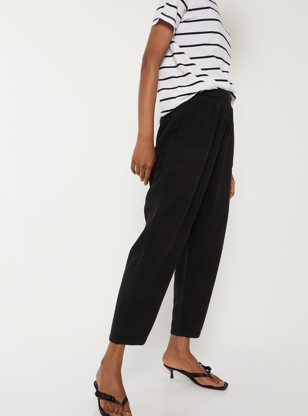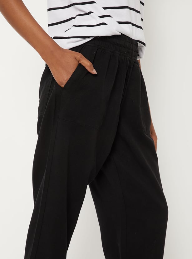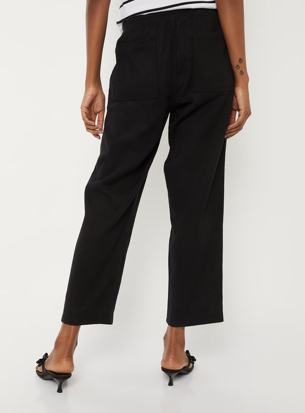 Effortless and versatile, these solid ankle-length trousers feature an elasticated waist for comfort and handy pockets for practicality. Perfect for everyday wear with a clean, modern look.