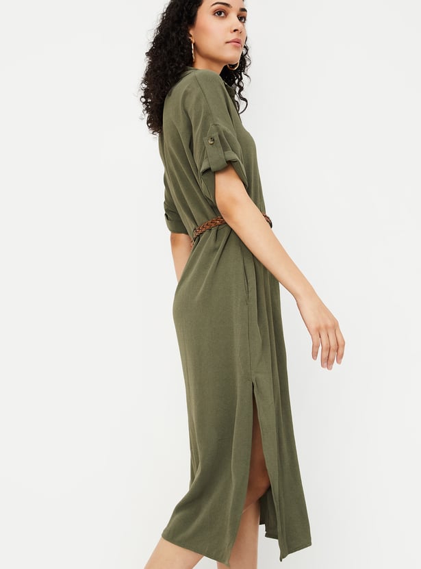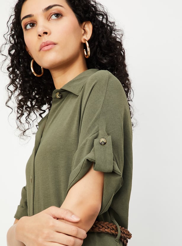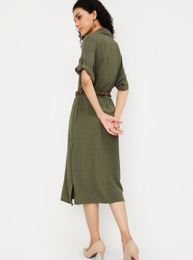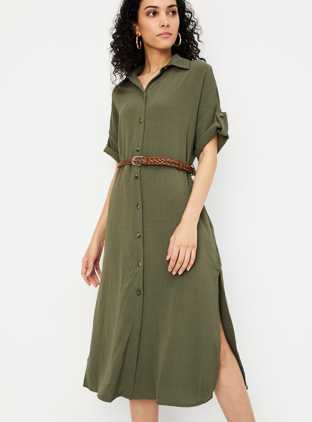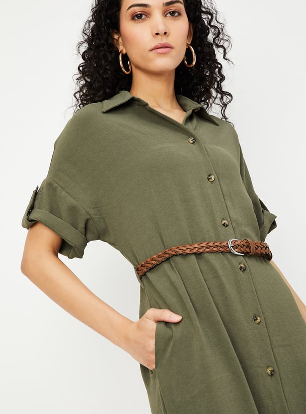 Women Solid Belted Shirt Dress