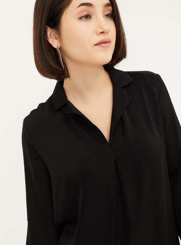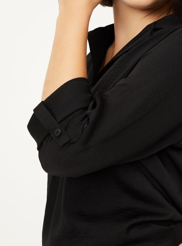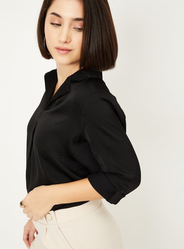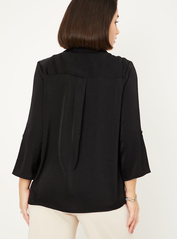 Add a touch of sophistication to your wardrobe with this solid blouse, featuring a collared design and pleated front for added texture. The 3/4th sleeves with tabs offer a versatile, stylish look.