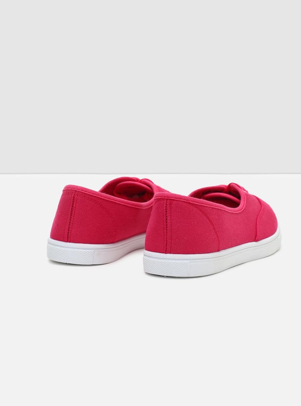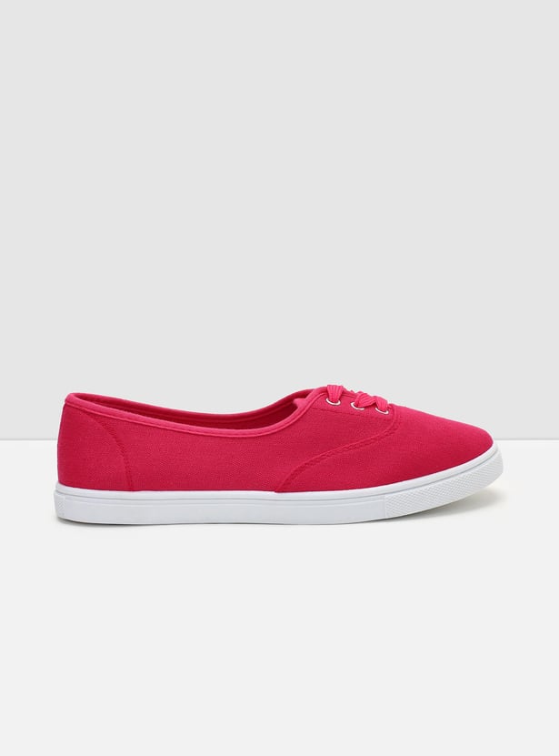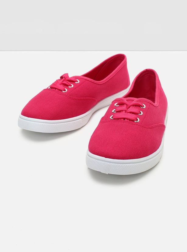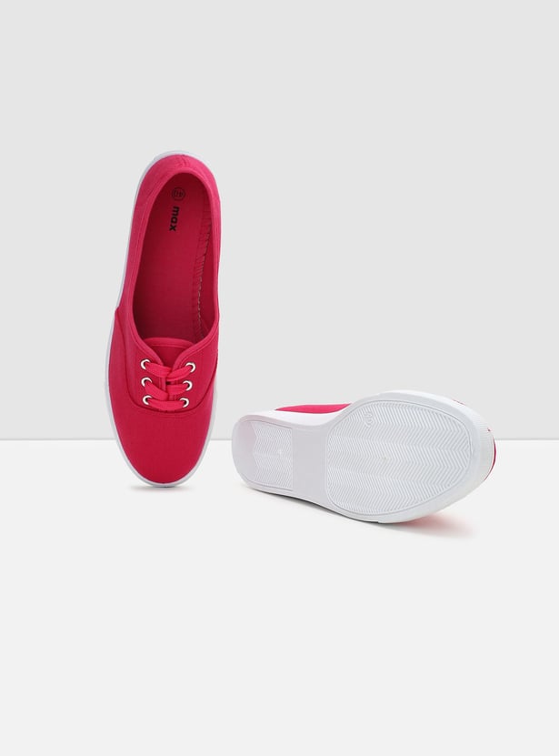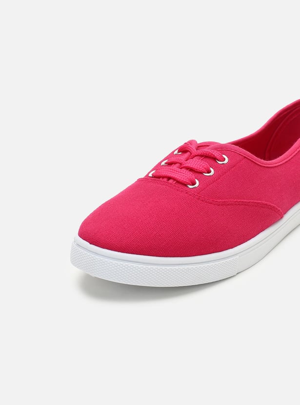 Up your sneaker game with this pair of casual shoes. It features a canvas upper, round-toe design, lace-up closure, padded collar, cushioned footbed, and durable outsole.