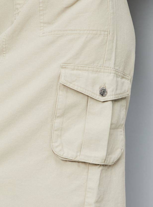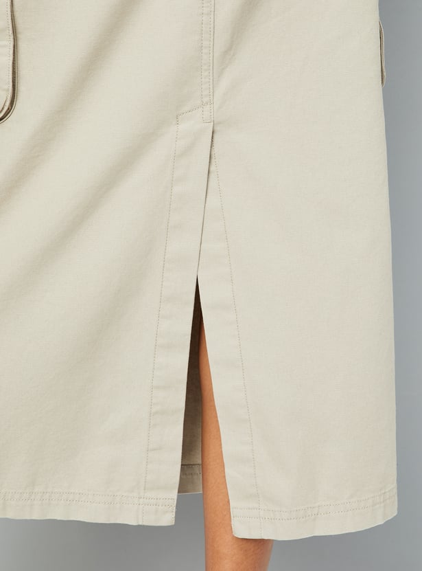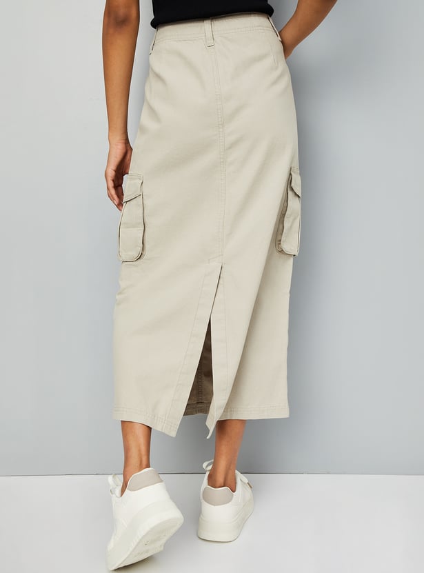 This solid cargo skirt blends utility and style with its button closure, belt loops, and functional pockets. The midi length adds a touch of sophistication, making it a versatile piece for casual or edgy looks.