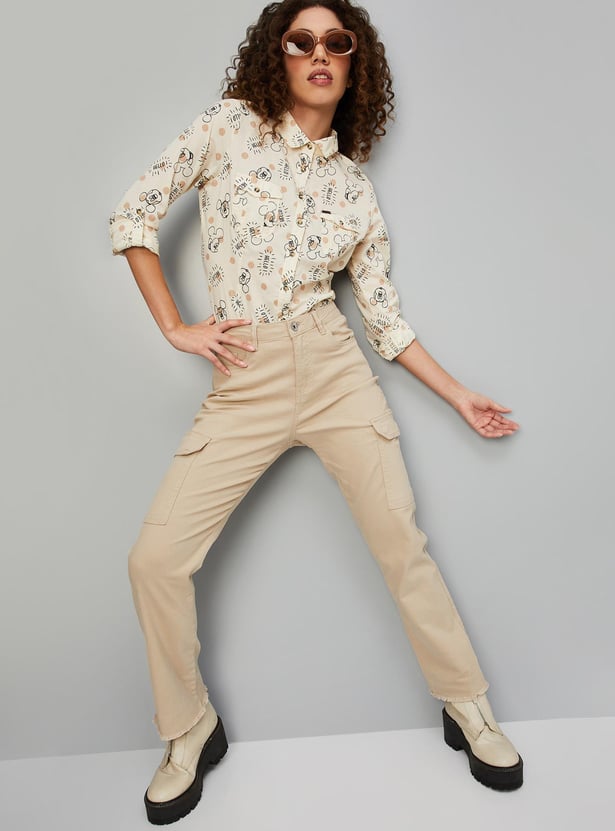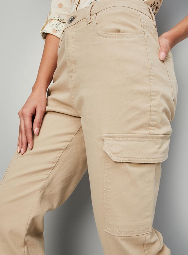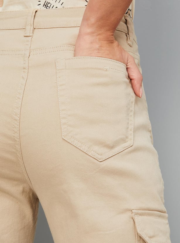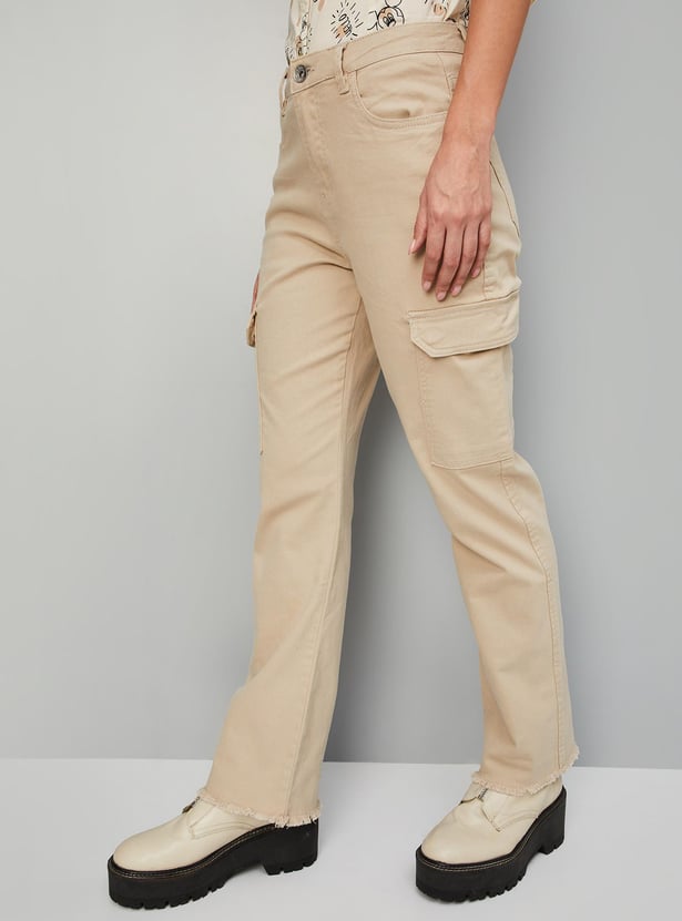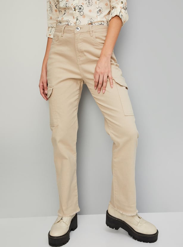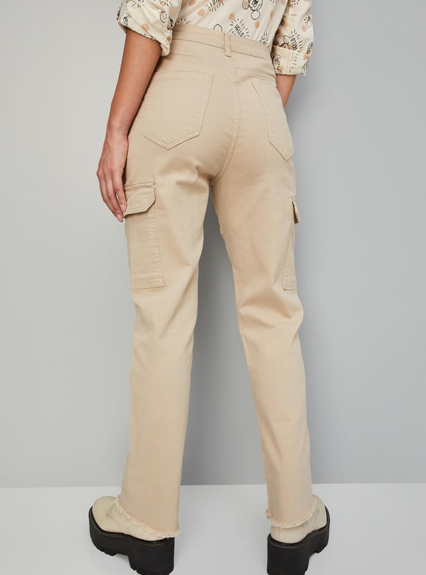 Elevate your street style with these solid trousers featuring a belt loop waist, four pockets including cargo pockets, and a frayed hem.