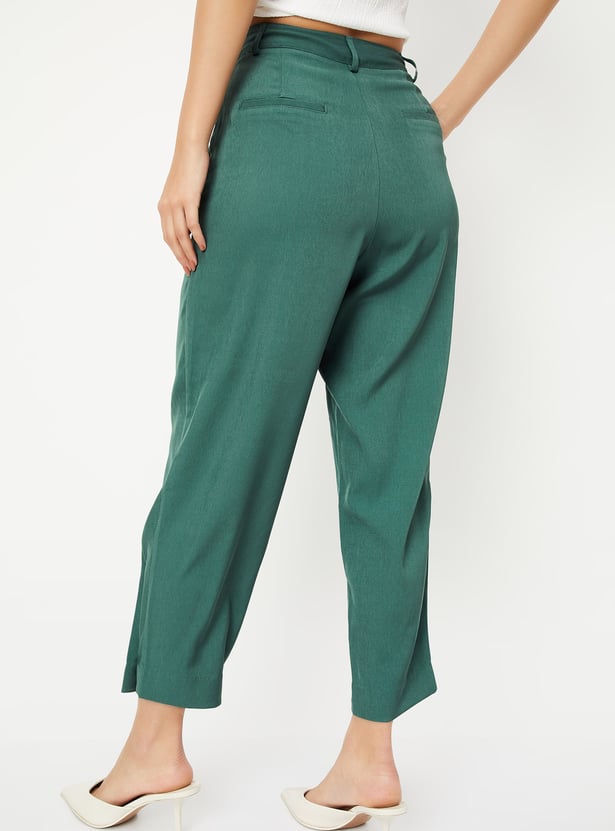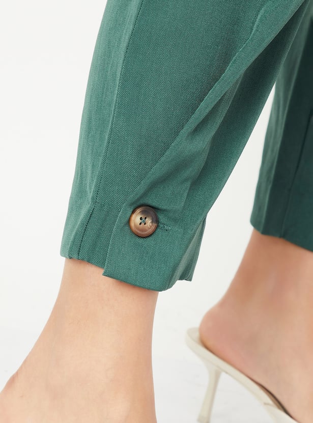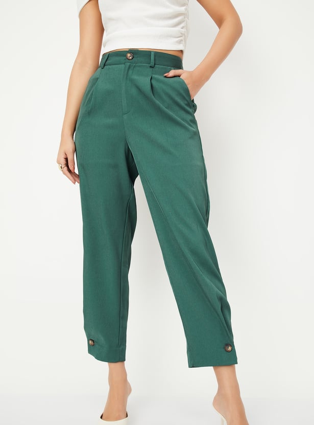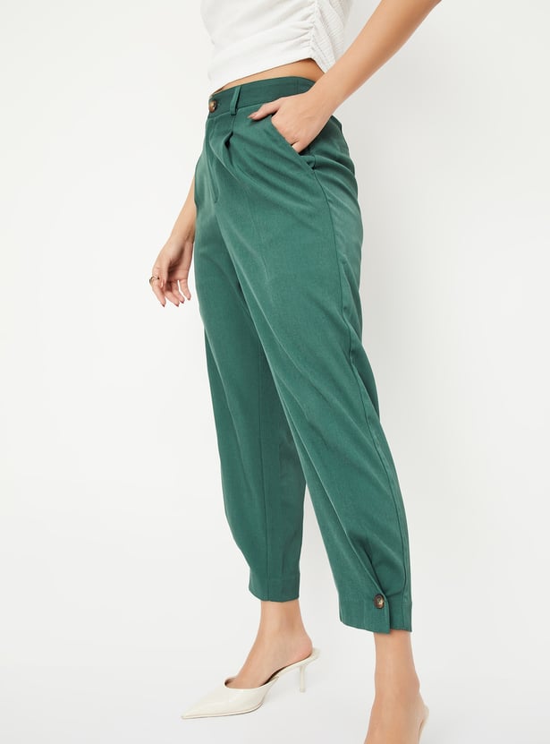 These solid carrot fit trousers offer a modern, flattering silhouette with a button closure for a secure fit. Designed with insert pockets and belt loops, they combine style and functionality for everyday wear. Perfect for dressing up or down, these trousers are a versatile addition to any wardrobe.